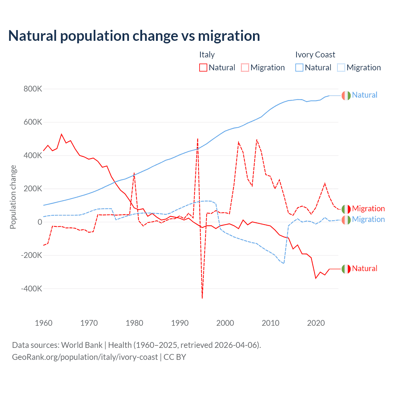 Over the last 10 years, 68.6% of the population change in Italy is from natural causes (a loss of 2,239,084 people) and 31.4% is from migration (a gain of 1,026,128 people). In Ivory Coast 99.7% is from natural causes (a gain of 7,348,944 people) and 0.33% is from migration (a gain of 24,432 people).