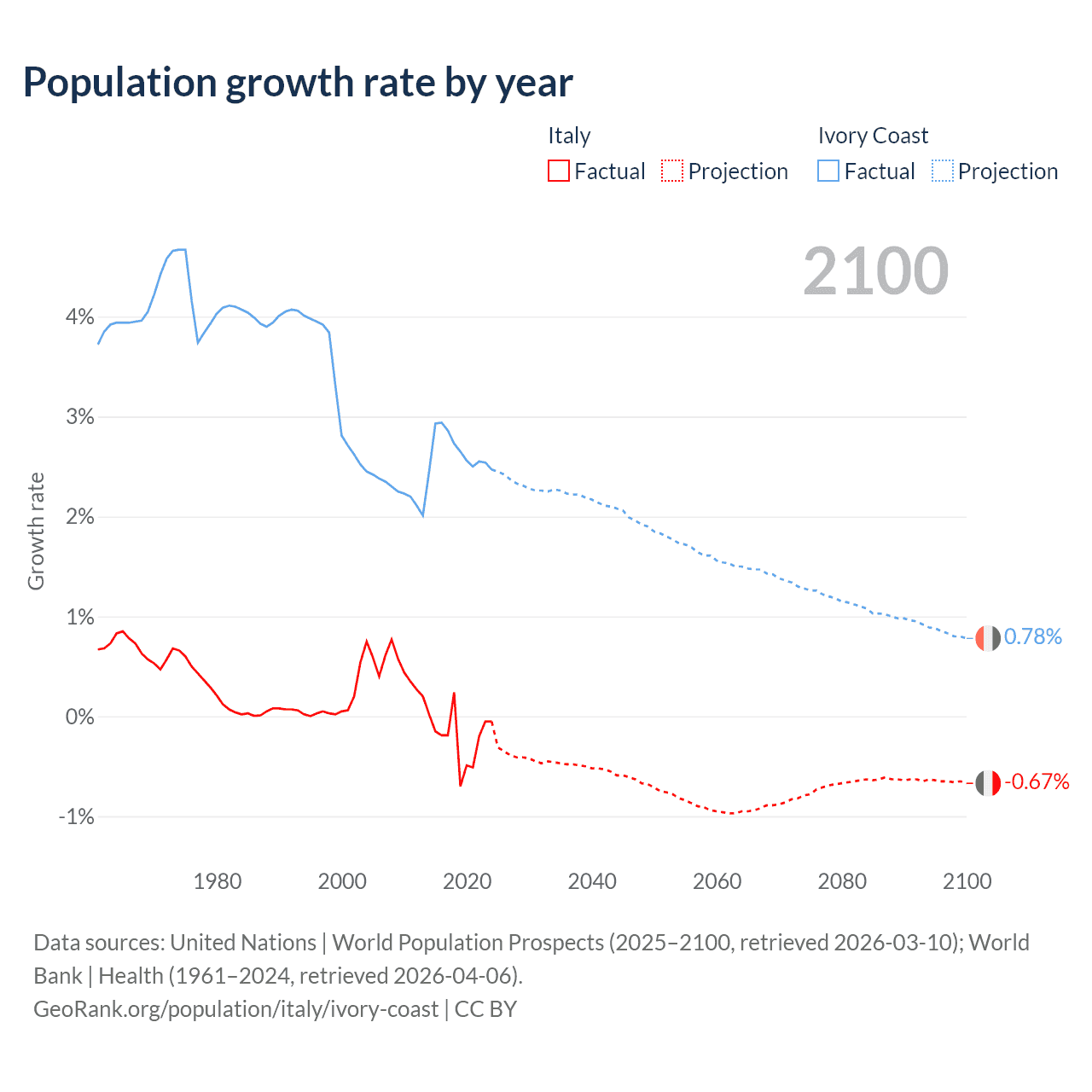 - For the last 10 years, Italy has had an average growth rate of -0.21% per year vs +2.65% in Ivory Coast.