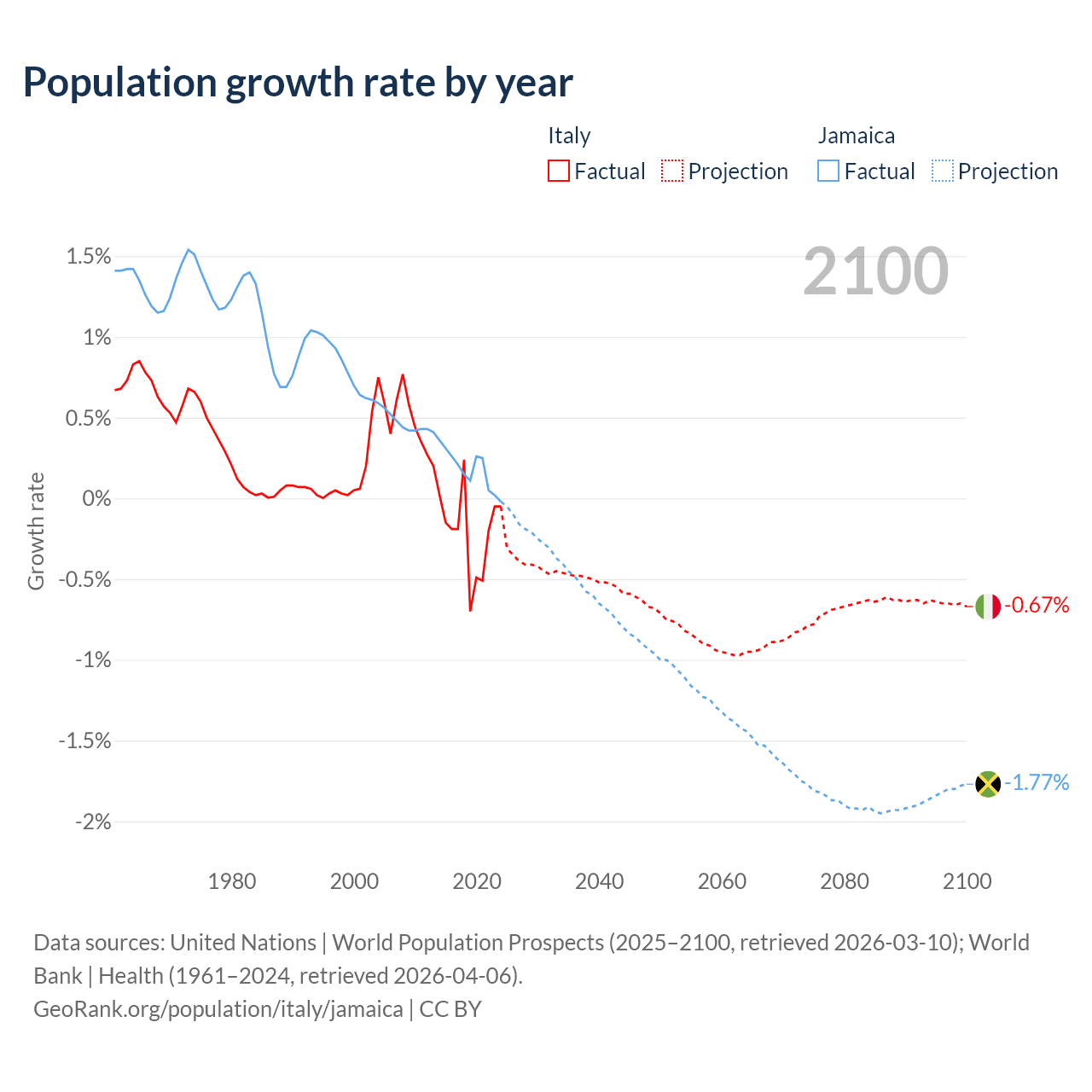 - For the last 10 years, Italy has had an average growth rate of -0.21% per year vs +0.18% in Jamaica.