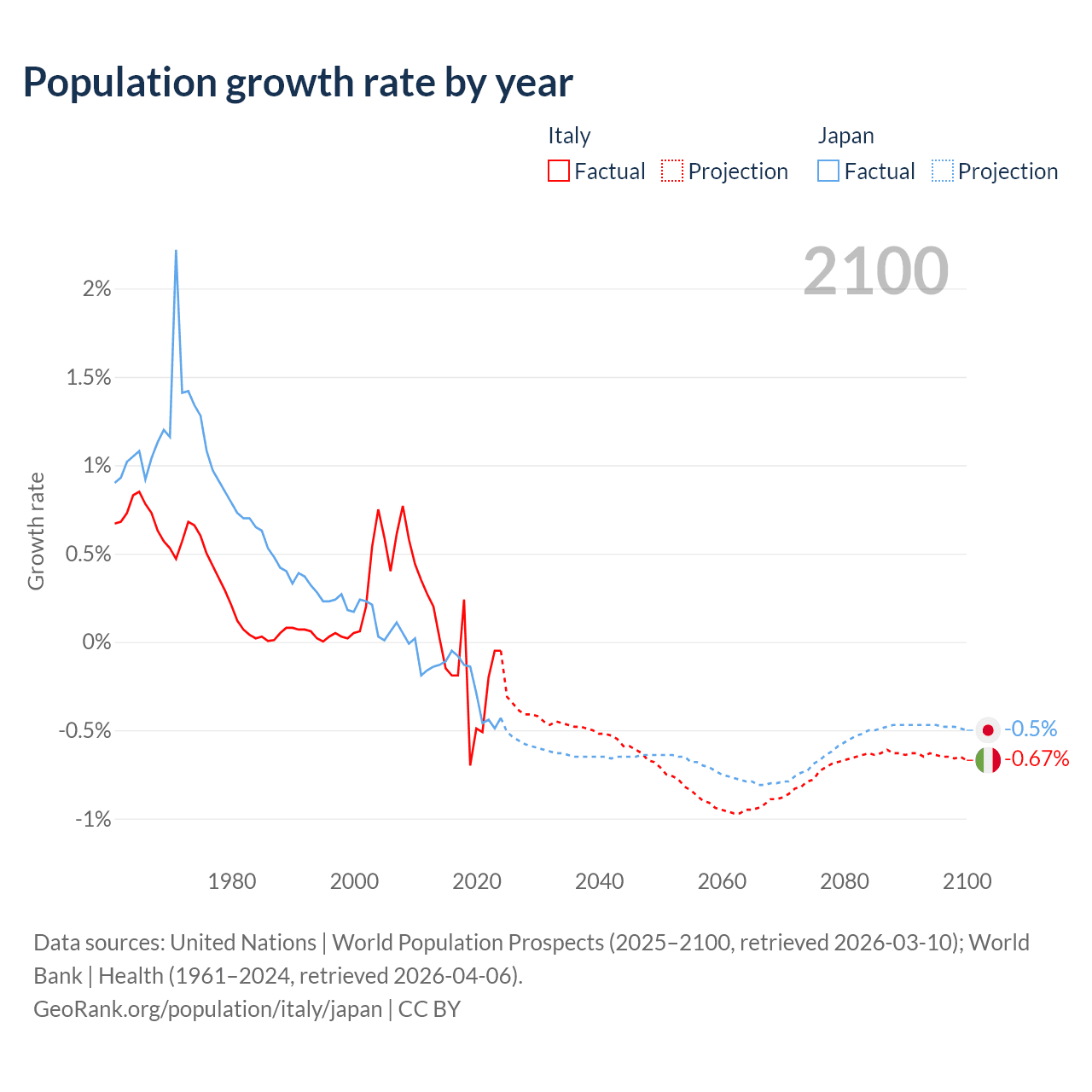 - For the last 10 years, Italy has had an average growth rate of -0.21% per year vs -0.25% in Japan.