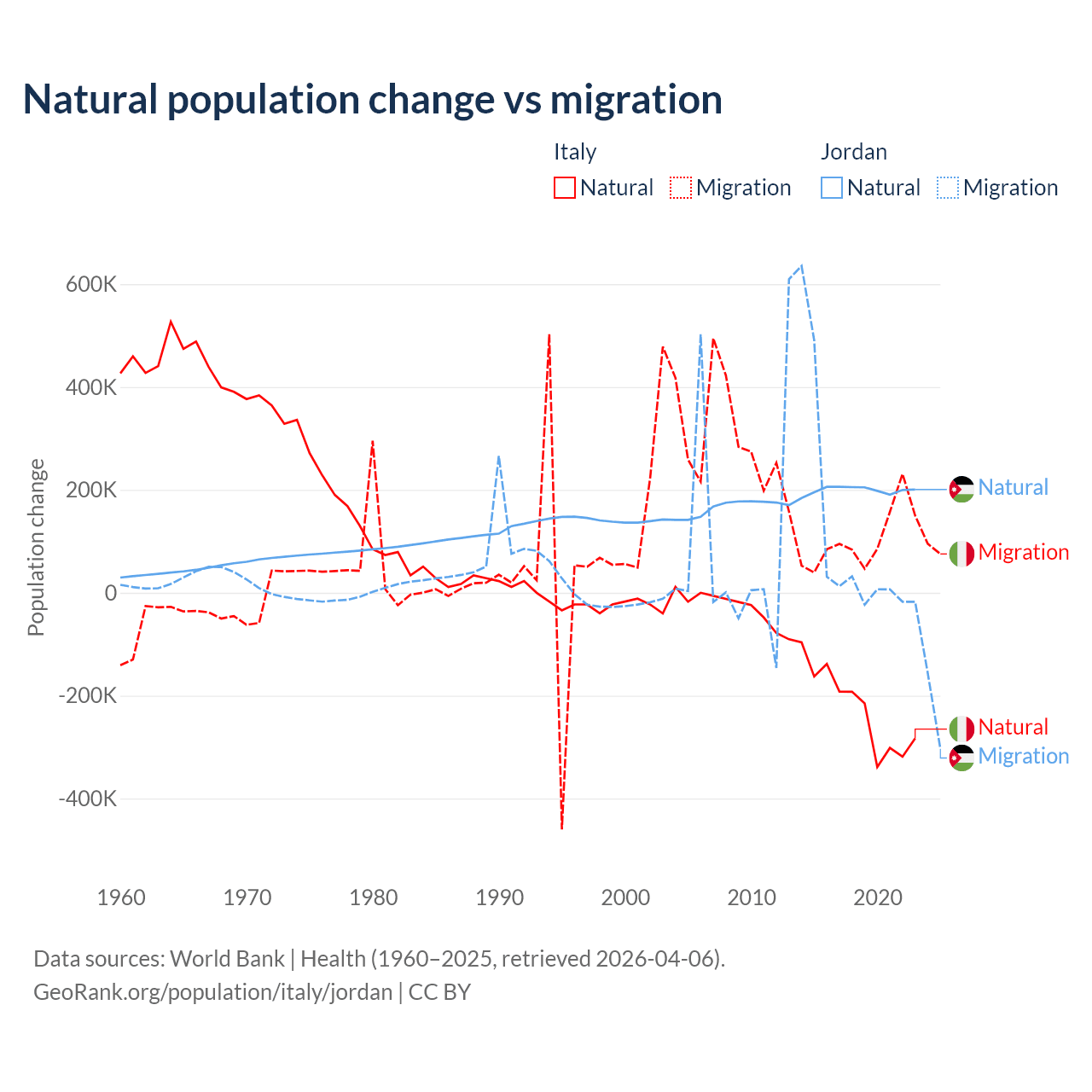 Over the last 10 years, 68.6% of the population change in Italy is from natural causes (a loss of 2,239,084 people) and 31.4% is from migration (a gain of 1,026,128 people). In Jordan 63.2% is from natural causes (a gain of 1,991,452 people) and 36.8% is from migration (a gain of 1,157,625 people).
