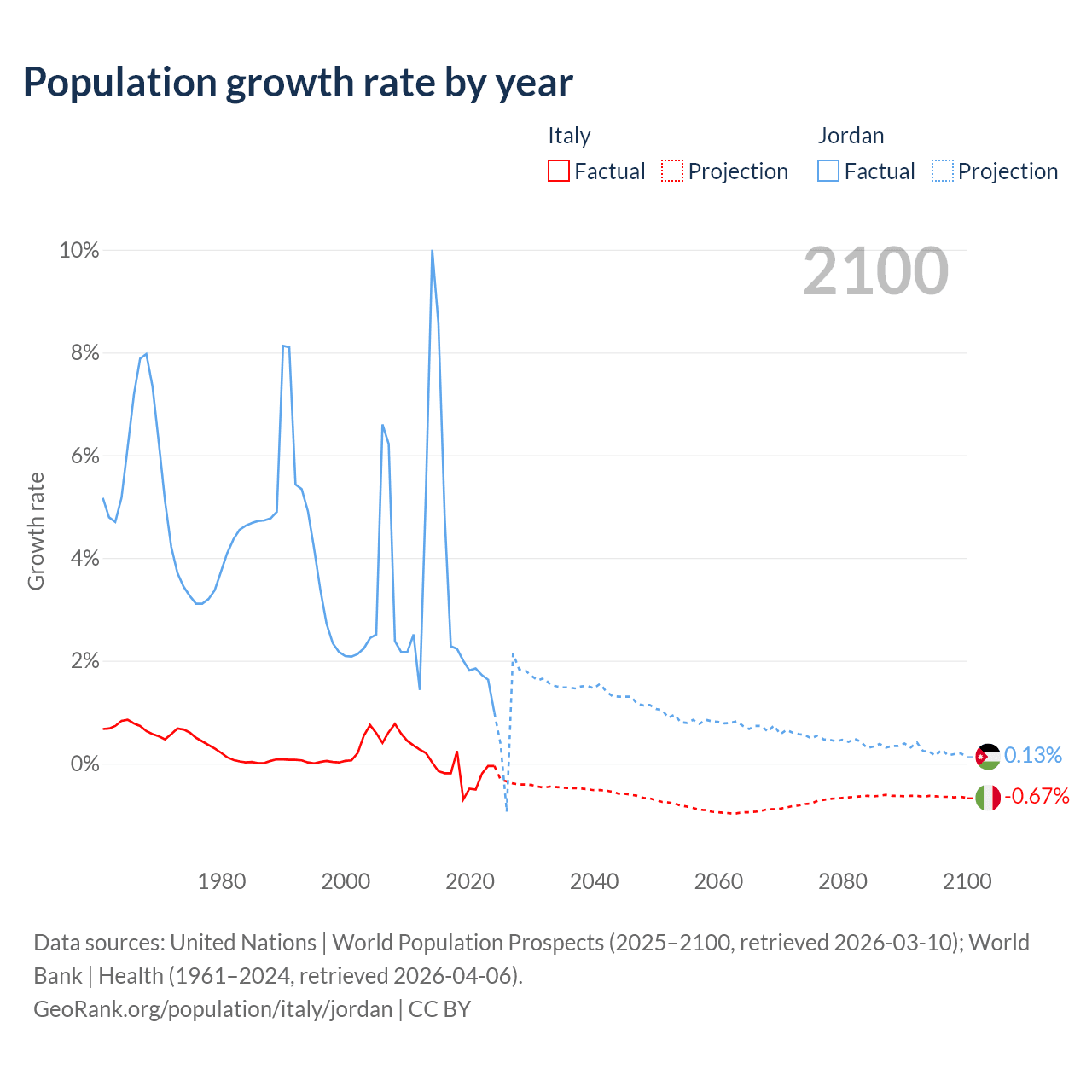 - For the last 10 years, Italy has had an average growth rate of -0.21% per year vs +3.45% in Jordan.