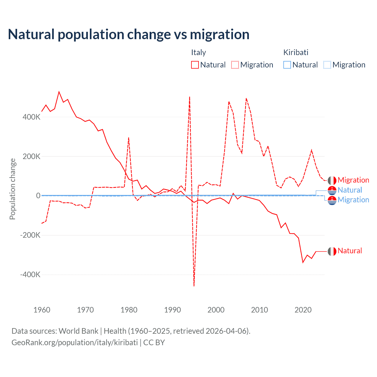 Over the last 10 years, 68.6% of the population change in Italy is from natural causes (a loss of 2,239,084 people) and 31.4% is from migration (a gain of 1,026,128 people). In Kiribati 80% is from natural causes (a gain of 25,262 people) and 20% is from migration (a loss of 6,330 people).