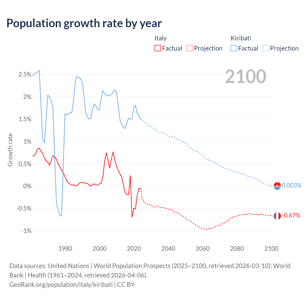 - For the last 10 years, Italy has had an average growth rate of -0.21% per year vs +1.53% in Kiribati.