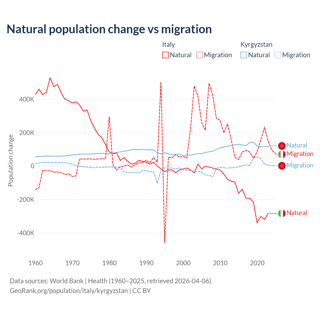 Over the last 10 years, 68.6% of the population change in Italy is from natural causes (a loss of 2,239,084 people) and 31.4% is from migration (a gain of 1,026,128 people). In Kyrgyzstan 88.5% is from natural causes (a gain of 1,258,837 people) and 11.5% is from migration (a gain of 164,132 people).