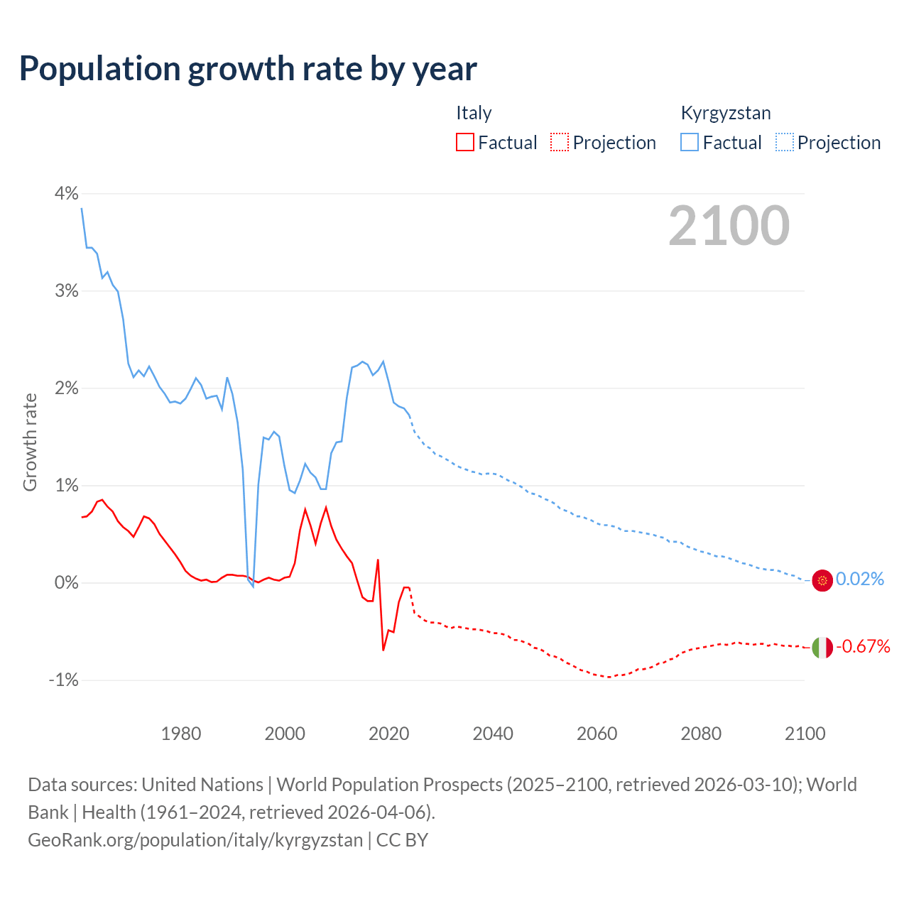- For the last 10 years, Italy has had an average growth rate of -0.21% per year vs +2.05% in Kyrgyzstan.