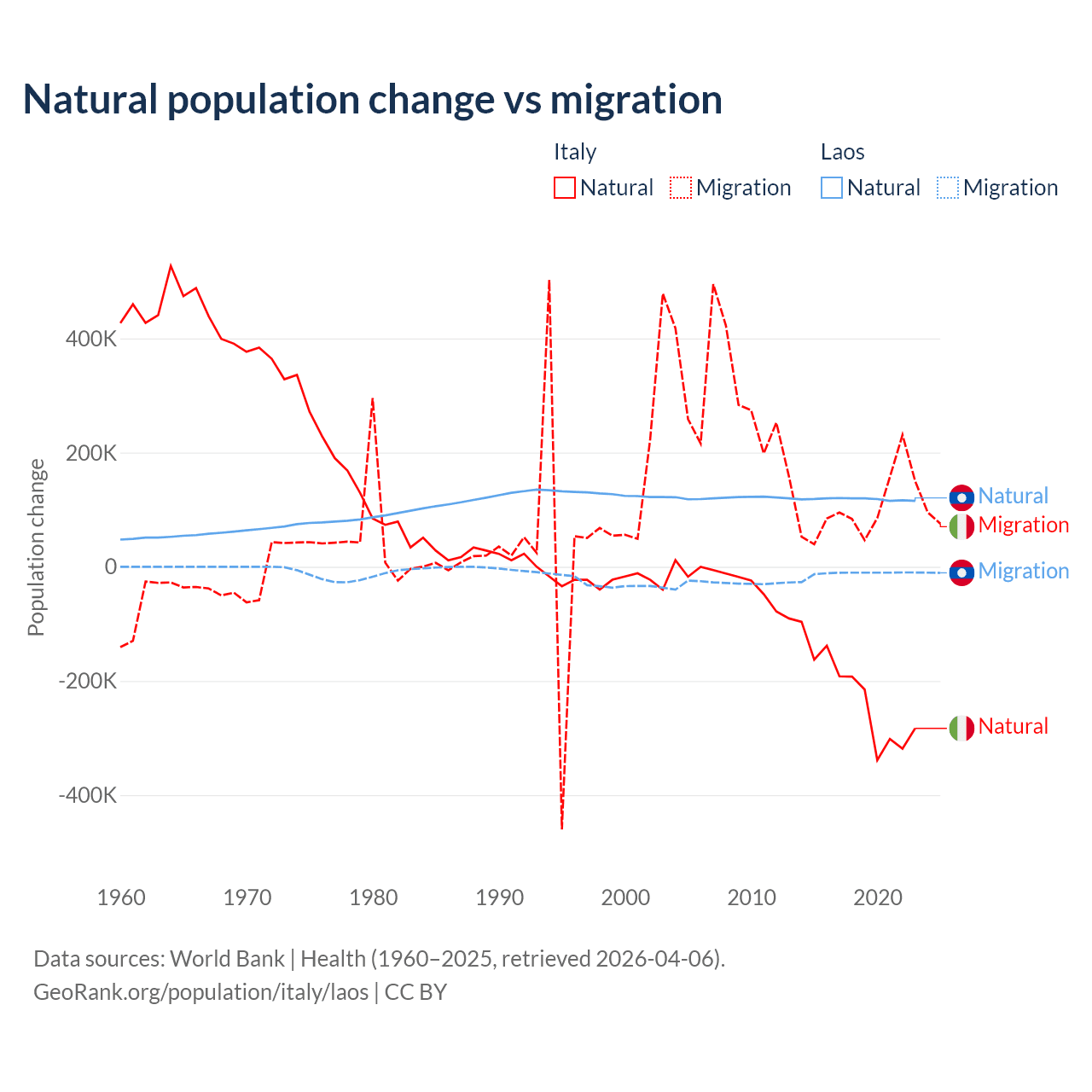 Over the last 10 years, 68.6% of the population change in Italy is from natural causes (a loss of 2,239,084 people) and 31.4% is from migration (a gain of 1,026,128 people). In Laos 90.6% is from natural causes (a gain of 1,183,013 people) and 9.41% is from migration (a loss of 122,899 people).