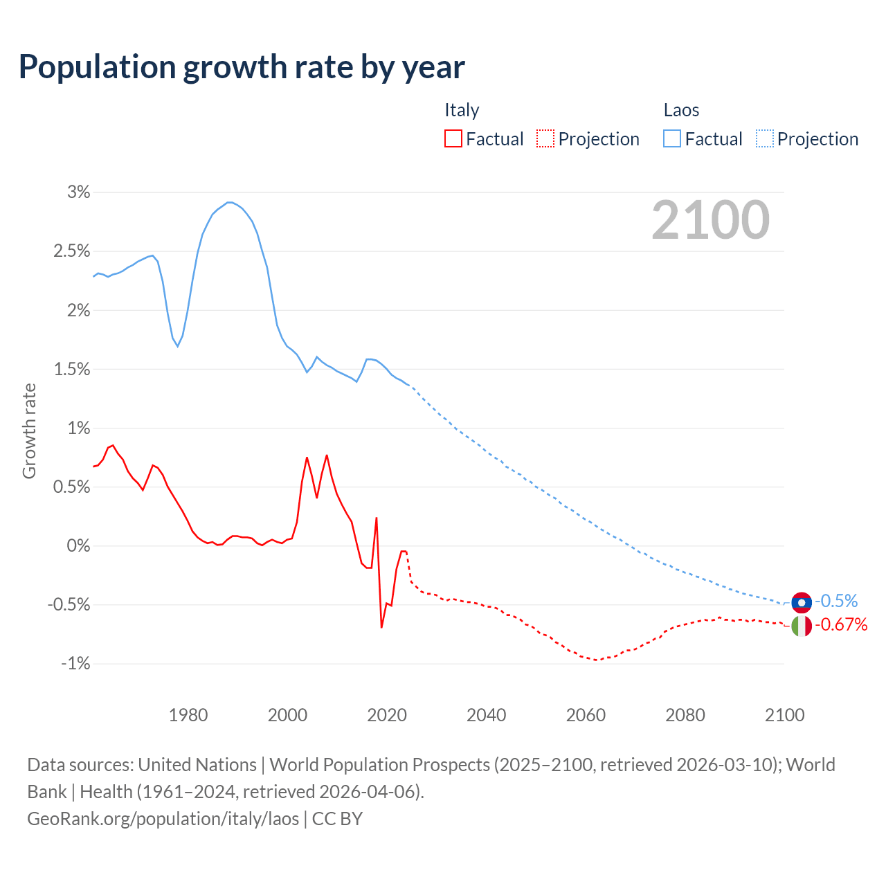 - For the last 10 years, Italy has had an average growth rate of -0.21% per year vs +1.48% in Laos.