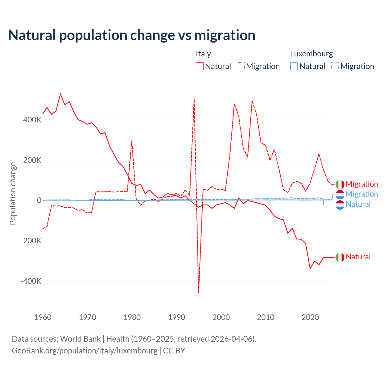 Over the last 10 years, 68.6% of the population change in Italy is from natural causes (a loss of 2,239,084 people) and 31.4% is from migration (a gain of 1,026,128 people). In Luxembourg 16.8% is from natural causes (a gain of 20,287 people) and 83.2% is from migration (a gain of 100,435 people).