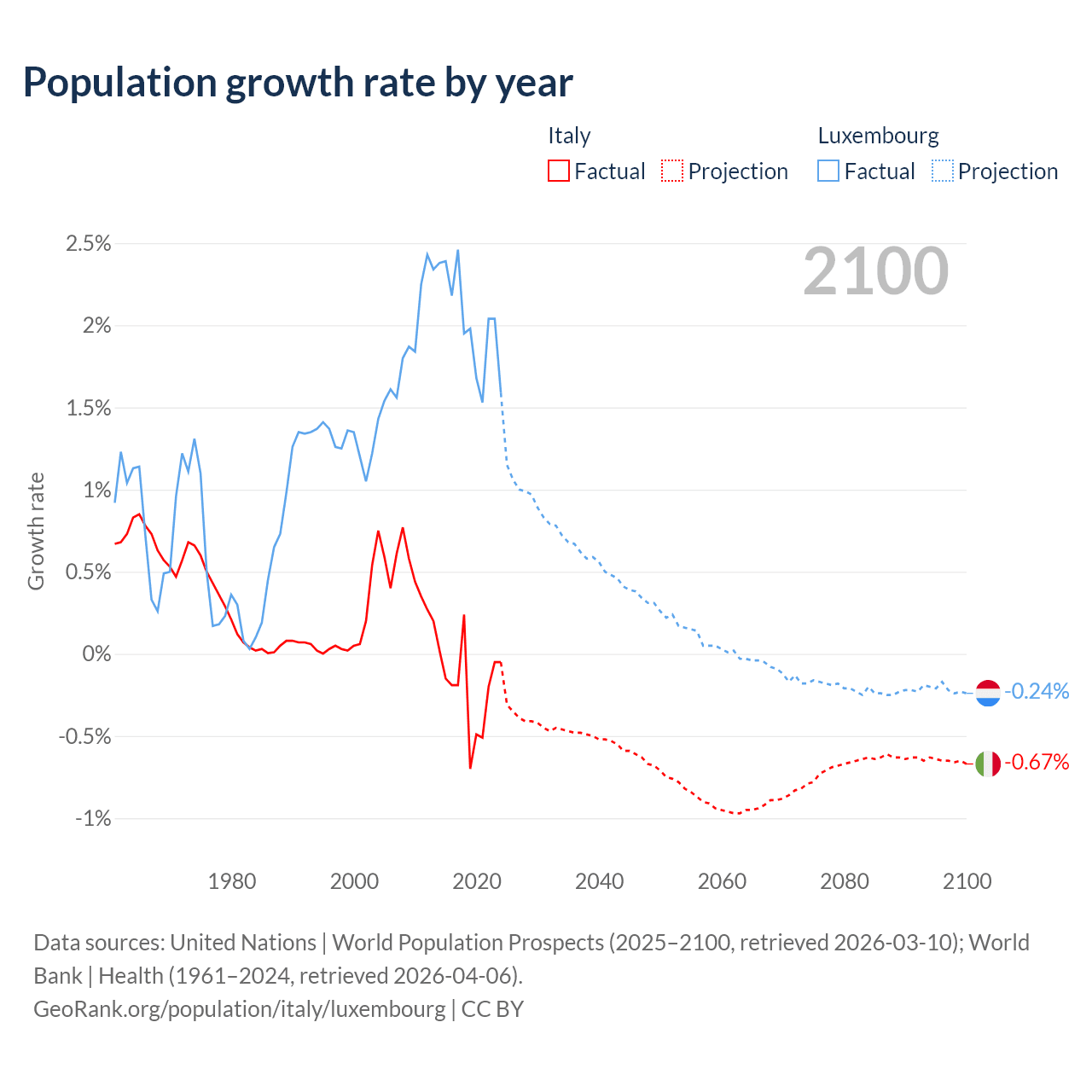 - For the last 10 years, Italy has had an average growth rate of -0.21% per year vs +2.02% in Luxembourg.