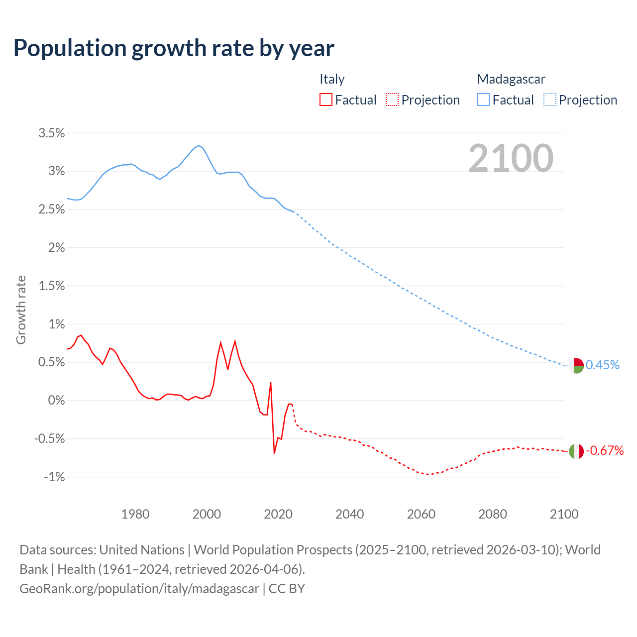 - For the last 10 years, Italy has had an average growth rate of -0.21% per year vs +2.6% in Madagascar.