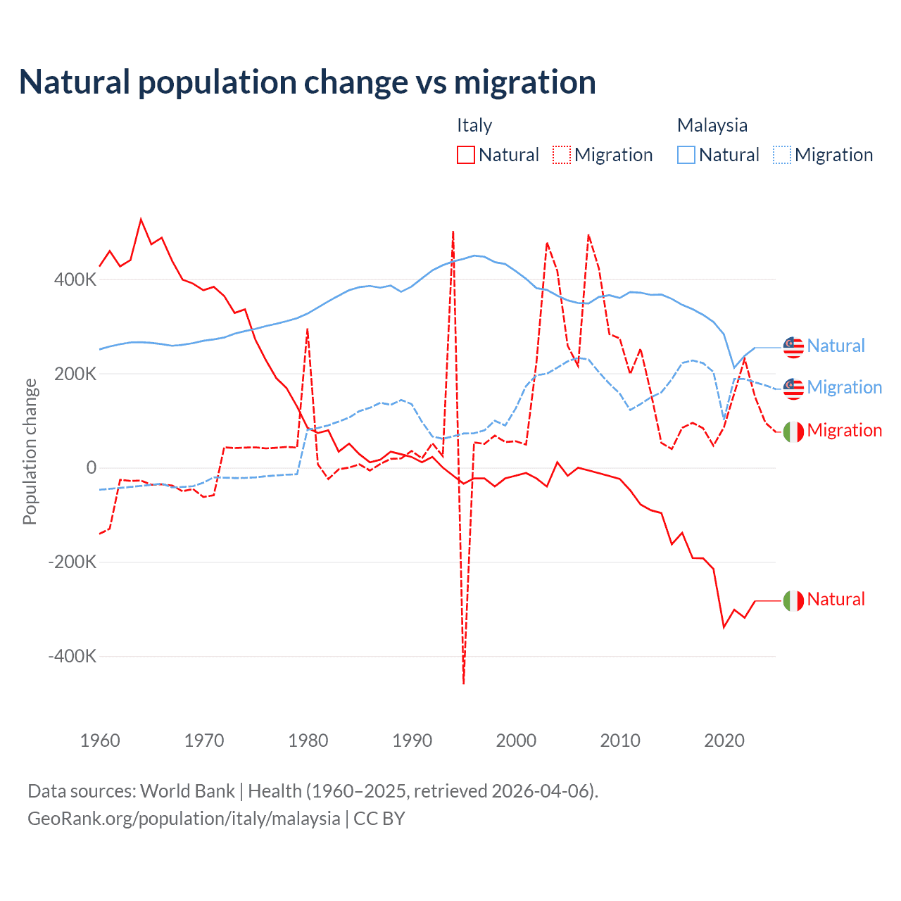 Over the last 10 years, 68.6% of the population change in Italy is from natural causes (a loss of 2,239,084 people) and 31.4% is from migration (a gain of 1,026,128 people). In Malaysia 61.7% is from natural causes (a gain of 3,029,648 people) and 38.3% is from migration (a gain of 1,882,159 people).