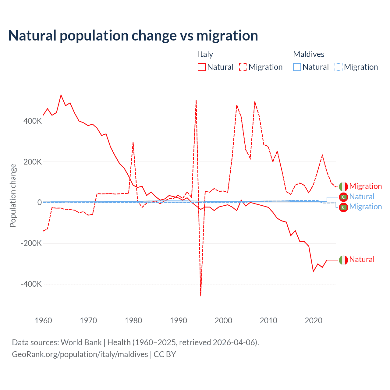 Over the last 10 years, 68.6% of the population change in Italy is from natural causes (a loss of 2,239,084 people) and 31.4% is from migration (a gain of 1,026,128 people). In Maldives 42.7% is from natural causes (a gain of 51,342 people) and 57.3% is from migration (a gain of 68,788 people).