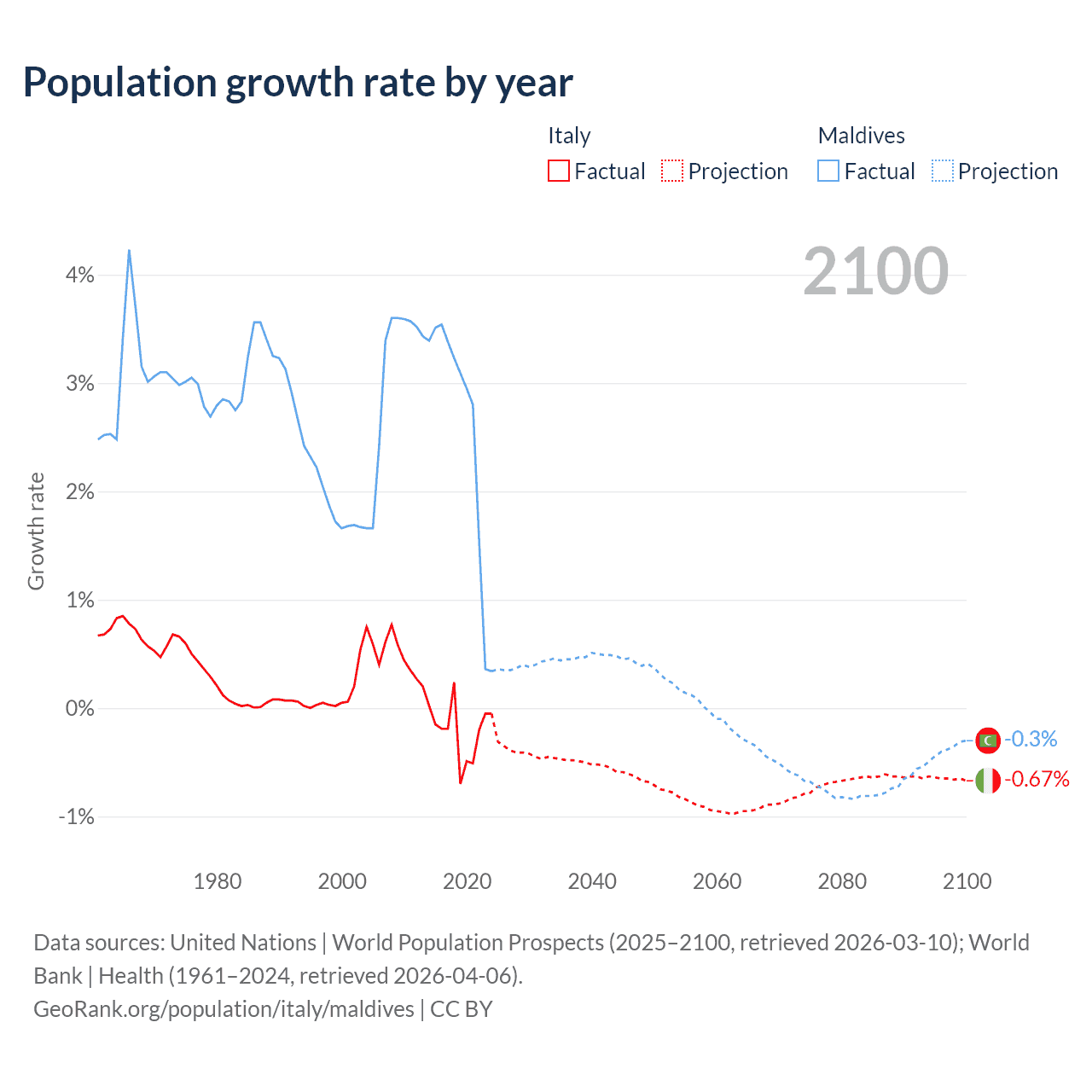 - For the last 10 years, Italy has had an average growth rate of -0.21% per year vs +2.56% in Maldives.