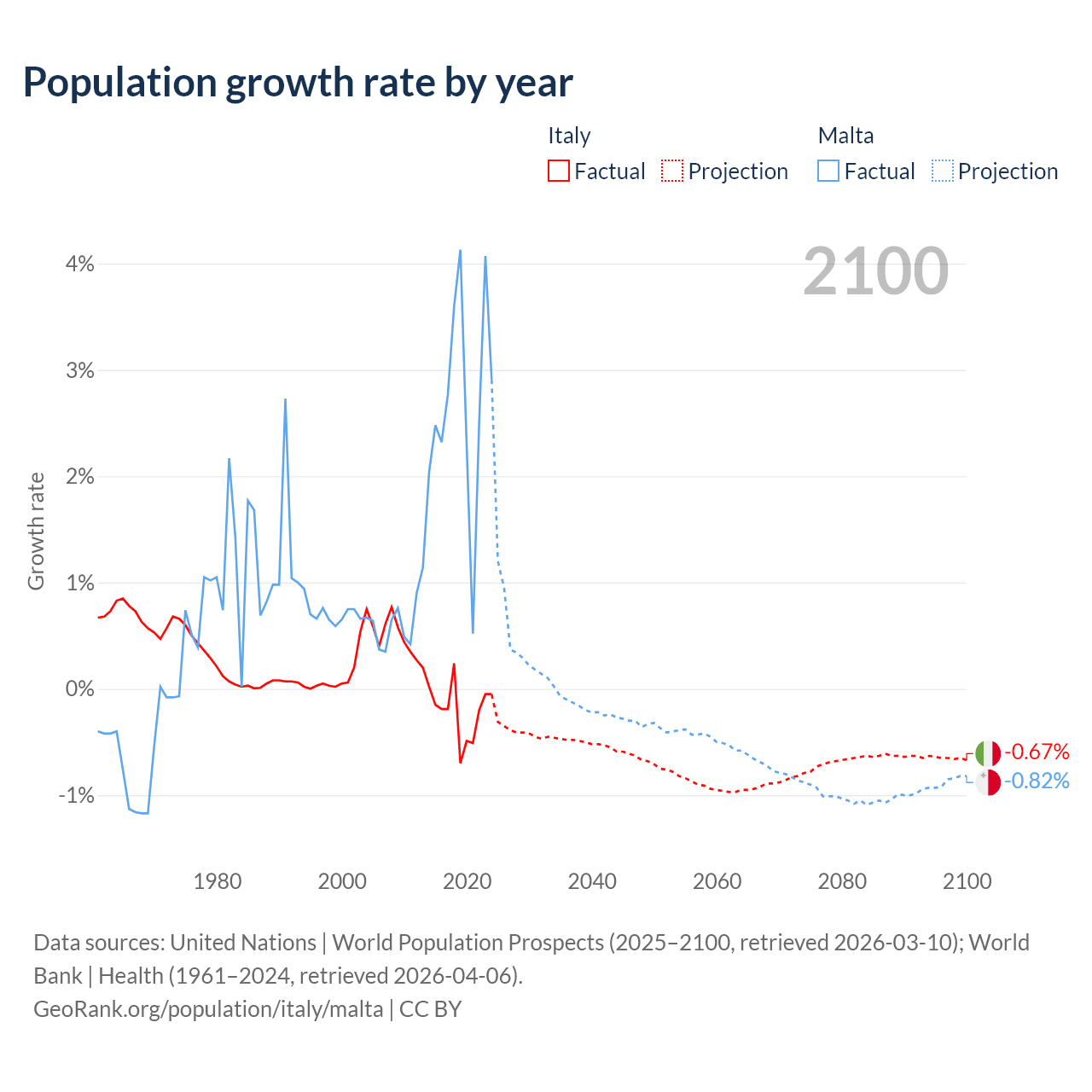 Data sources: World Bank | Health (1960–2024, retrieved 2026-04-06); United Nations | World Population Prospects (1960–2026, retrieved 2026-03-10); U.S. Census Bureau (1960–2025, retrieved 2026-02-08); Central Intelligence Agency (CIA) (2000–2019, retrieved 2026-02-20).