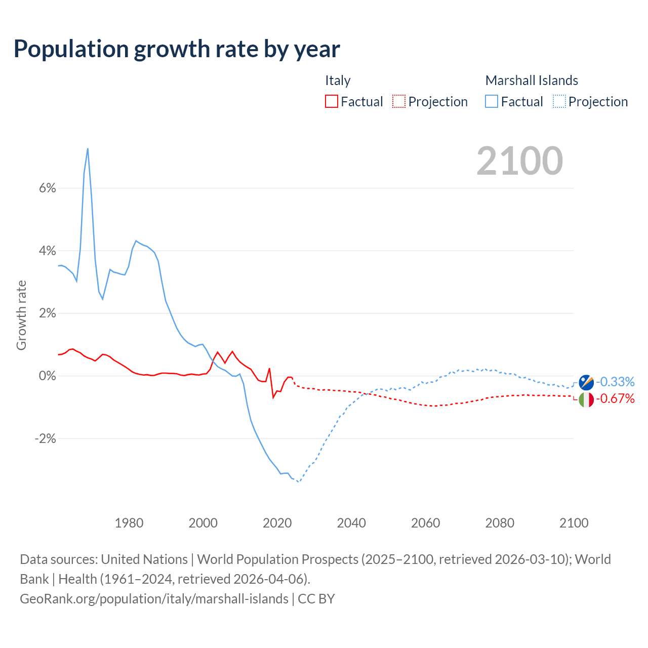 - For the last 10 years, Italy has had an average growth rate of -0.21% per year vs -2.69% in the Marshall Islands.