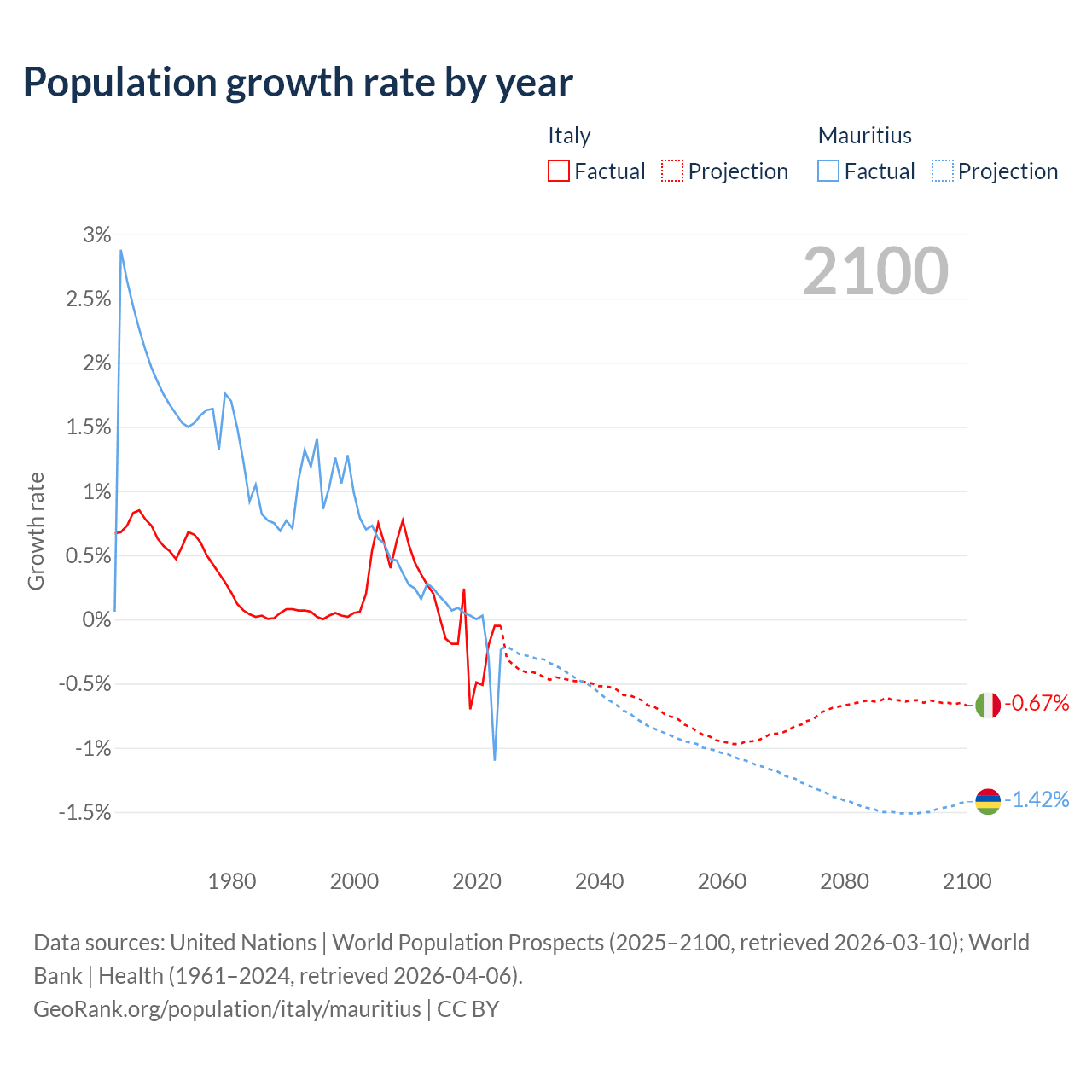 - For the last 10 years, Italy has had an average growth rate of -0.21% per year vs -0.09% in Mauritius.
