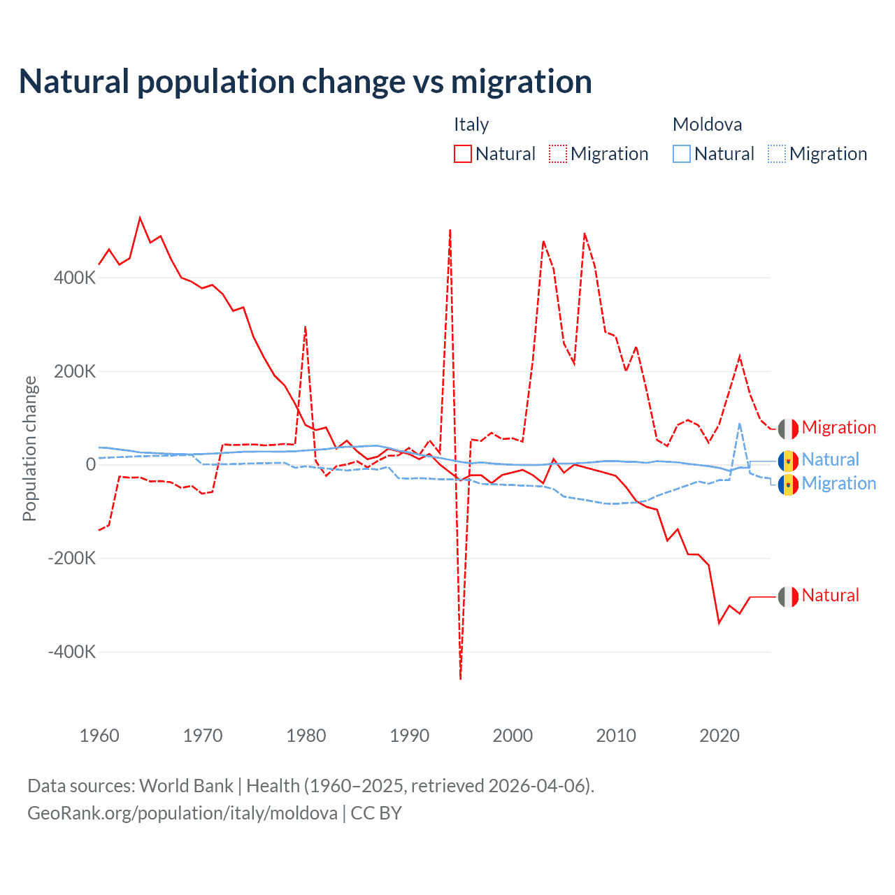 Over the last 10 years, 68.6% of the population change in Italy is from natural causes (a loss of 2,239,084 people) and 31.4% is from migration (a gain of 1,026,128 people). In Moldova 6.04% is from natural causes (a loss of 19,001 people) and 94% is from migration (a loss of 295,631 people).