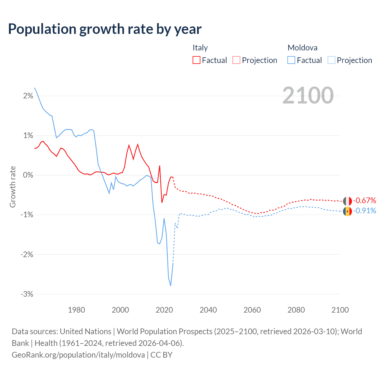 - For the last 10 years, Italy has had an average growth rate of -0.21% per year vs -1.57% in Moldova.