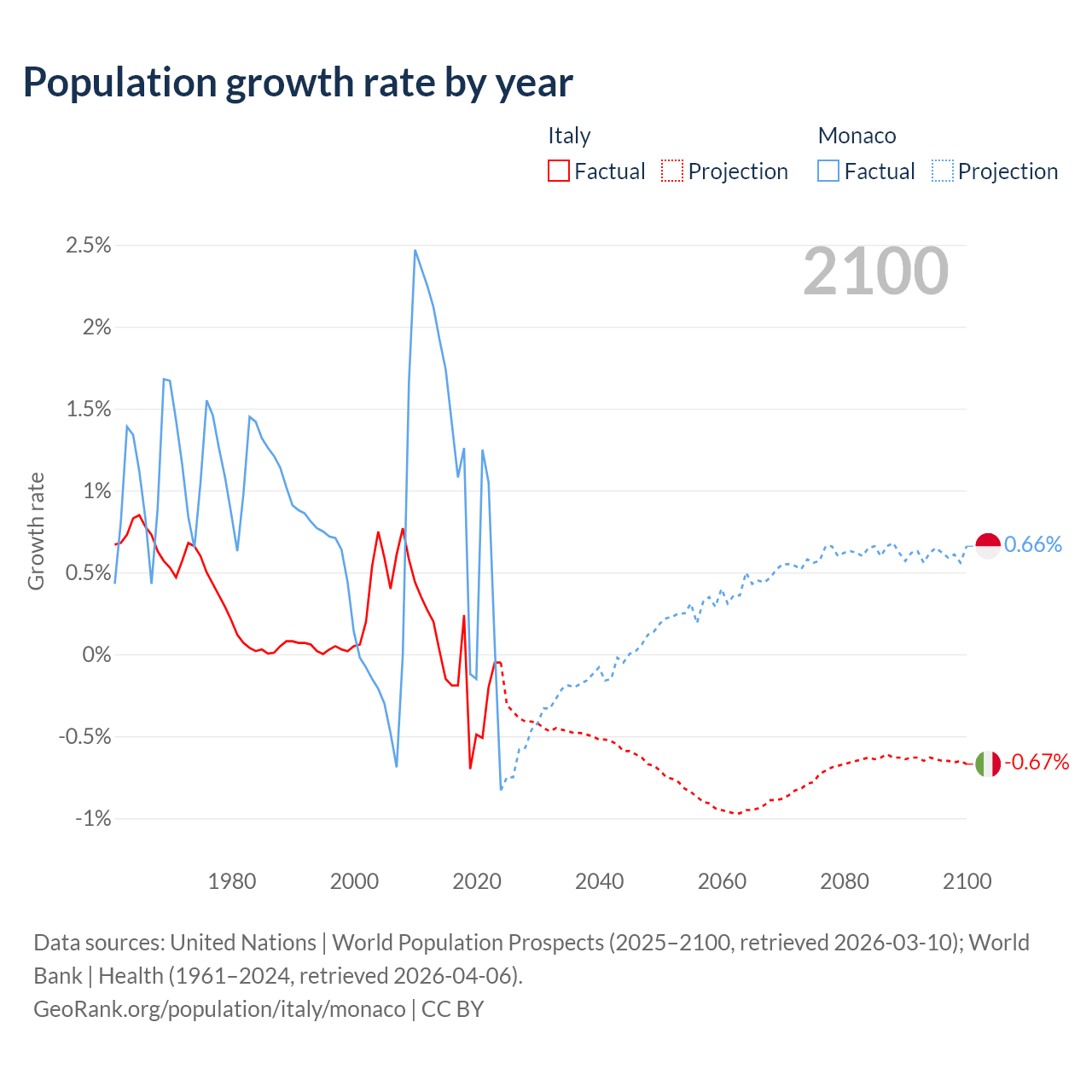- For the last 10 years, Italy has had an average growth rate of -0.21% per year vs +0.79% in Monaco.