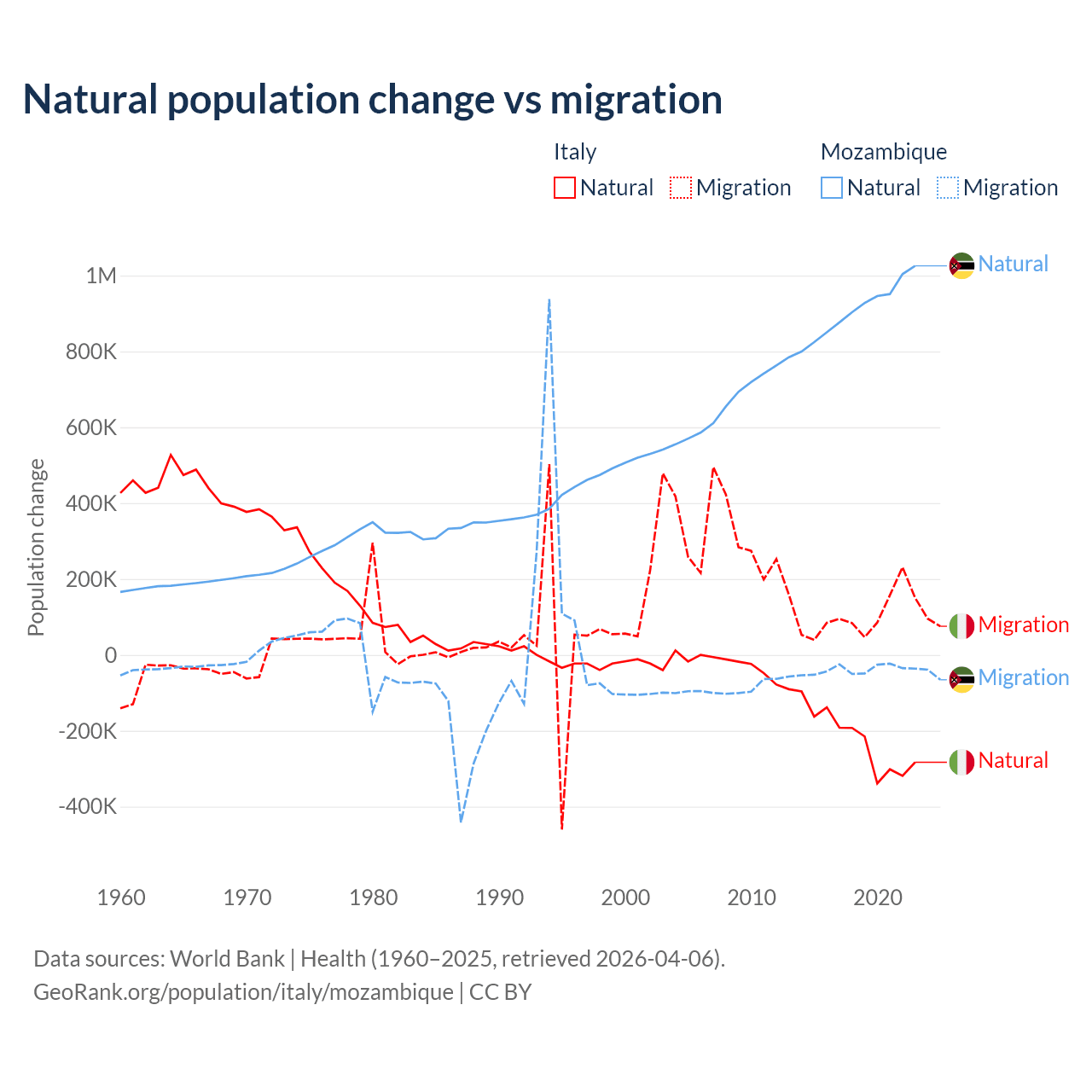 Over the last 10 years, 68.6% of the population change in Italy is from natural causes (a loss of 2,239,084 people) and 31.4% is from migration (a gain of 1,026,128 people). In Mozambique 95.9% is from natural causes (a gain of 9,108,203 people) and 4.15% is from migration (a loss of 393,923 people).