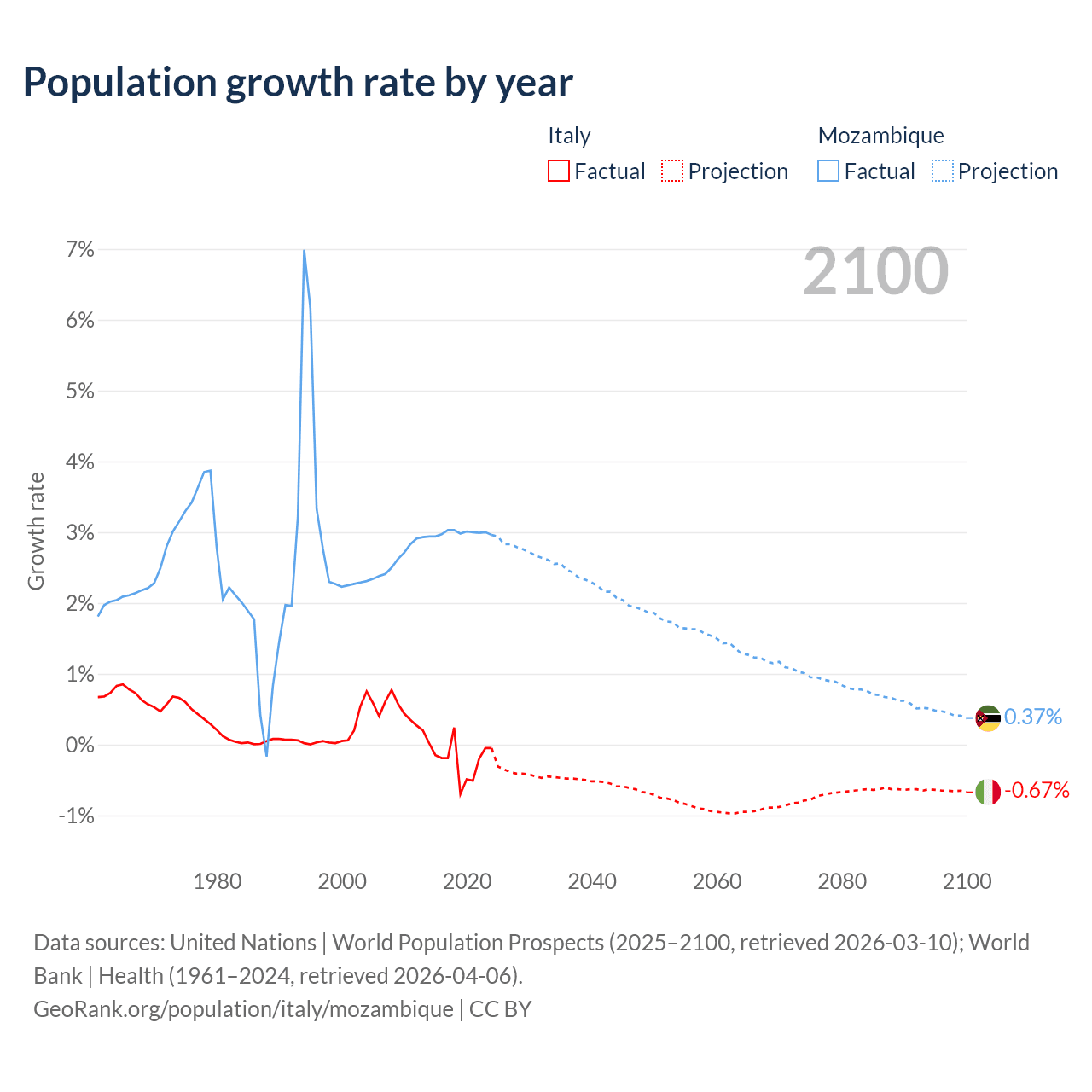 - For the last 10 years, Italy has had an average growth rate of -0.21% per year vs +2.99% in Mozambique.