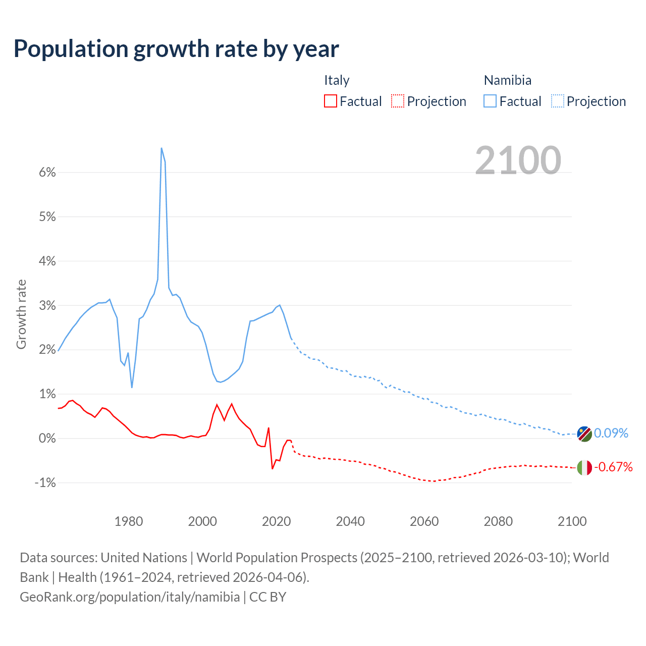 - For the last 10 years, Italy has had an average growth rate of -0.21% per year vs +2.73% in Namibia.