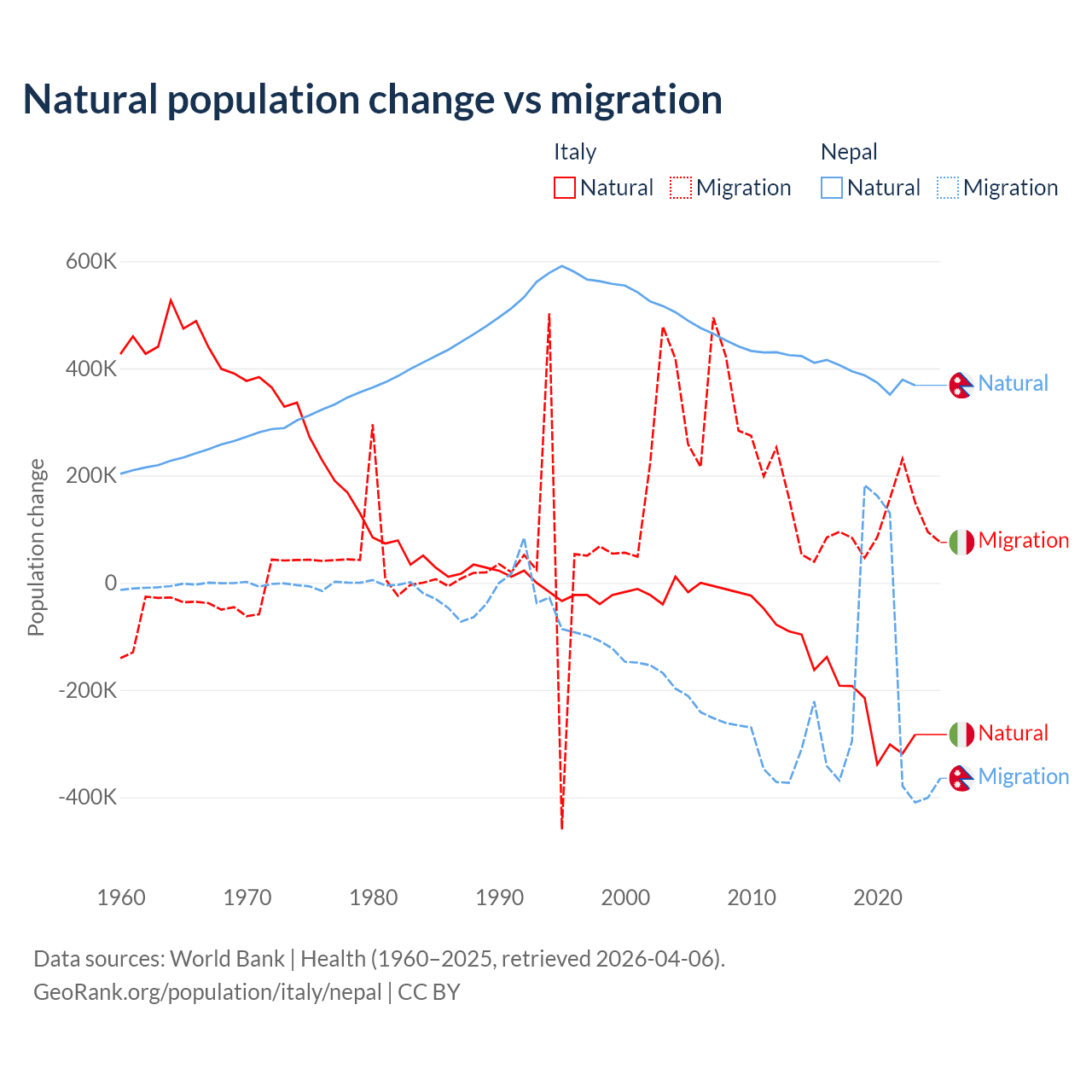Over the last 10 years, 68.6% of the population change in Italy is from natural causes (a loss of 2,239,084 people) and 31.4% is from migration (a gain of 1,026,128 people). In Nepal 67.9% is from natural causes (a gain of 3,909,749 people) and 32.1% is from migration (a loss of 1,851,664 people).