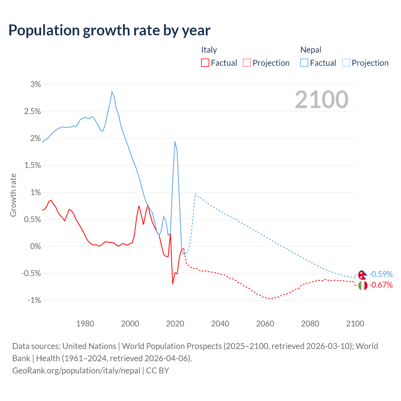- For the last 10 years, Italy has had an average growth rate of -0.21% per year vs +0.66% in Nepal.