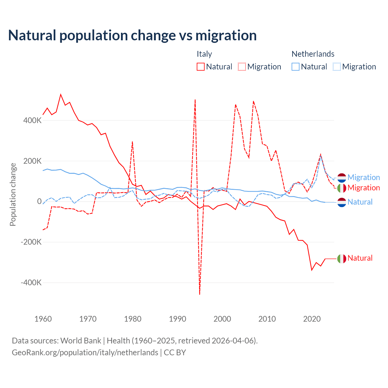 Over the last 10 years, 68.6% of the population change in Italy is from natural causes (a loss of 2,239,084 people) and 31.4% is from migration (a gain of 1,026,128 people). In the Netherlands 11.8% is from natural causes (a gain of 134,554 people) and 88.2% is from migration (a gain of 1,006,495 people).