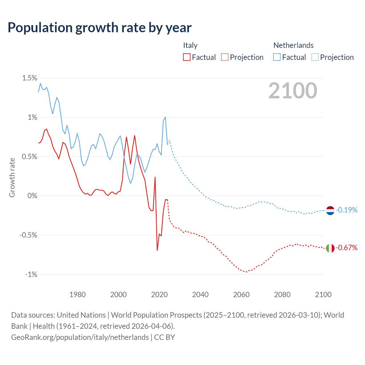 - For the last 10 years, Italy has had an average growth rate of -0.21% per year vs +0.62% in the Netherlands.