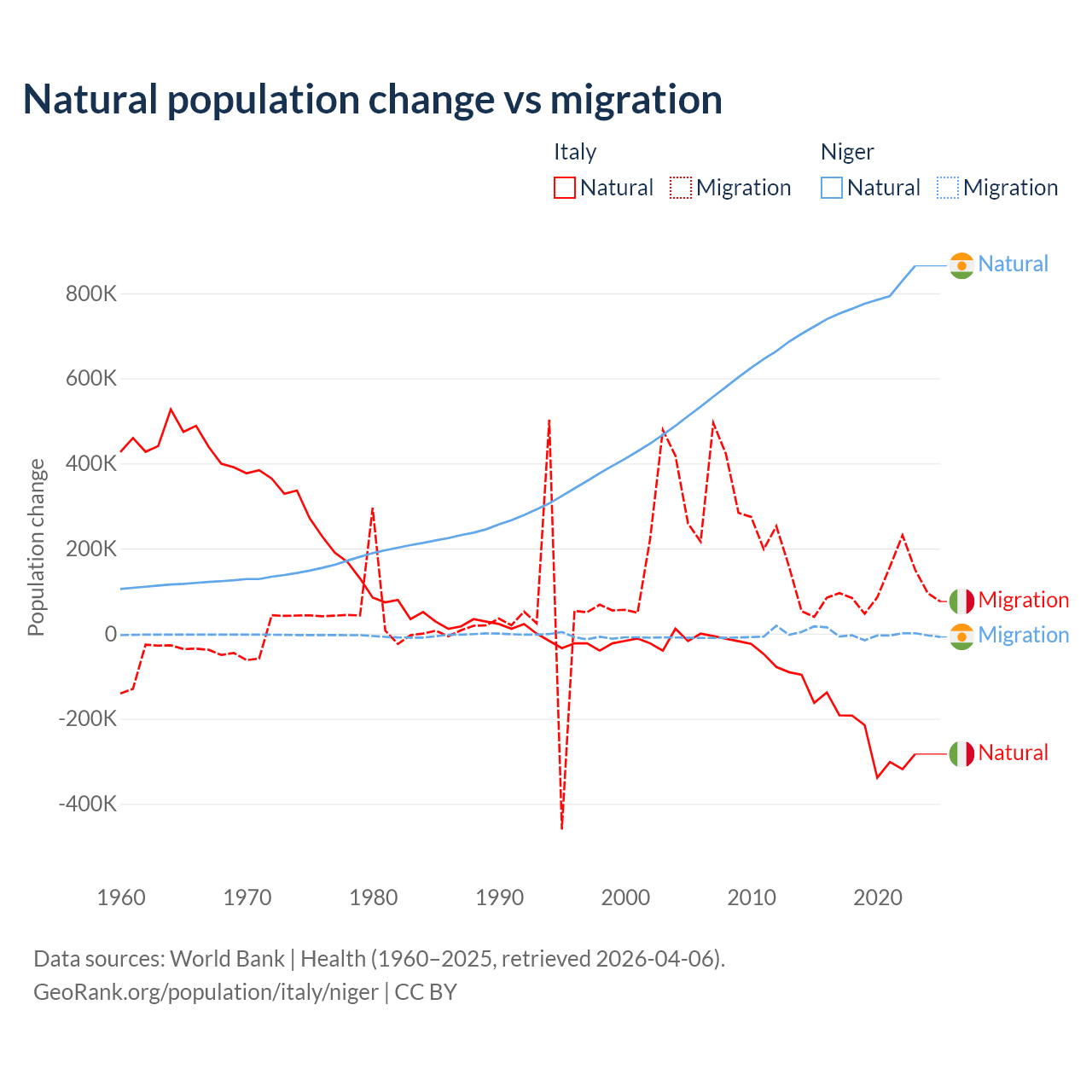 Over the last 10 years, 68.6% of the population change in Italy is from natural causes (a loss of 2,239,084 people) and 31.4% is from migration (a gain of 1,026,128 people). In Niger 100% is from natural causes (a gain of 7,728,287 people) and 0.03% is from migration (a gain of 2,520 people).