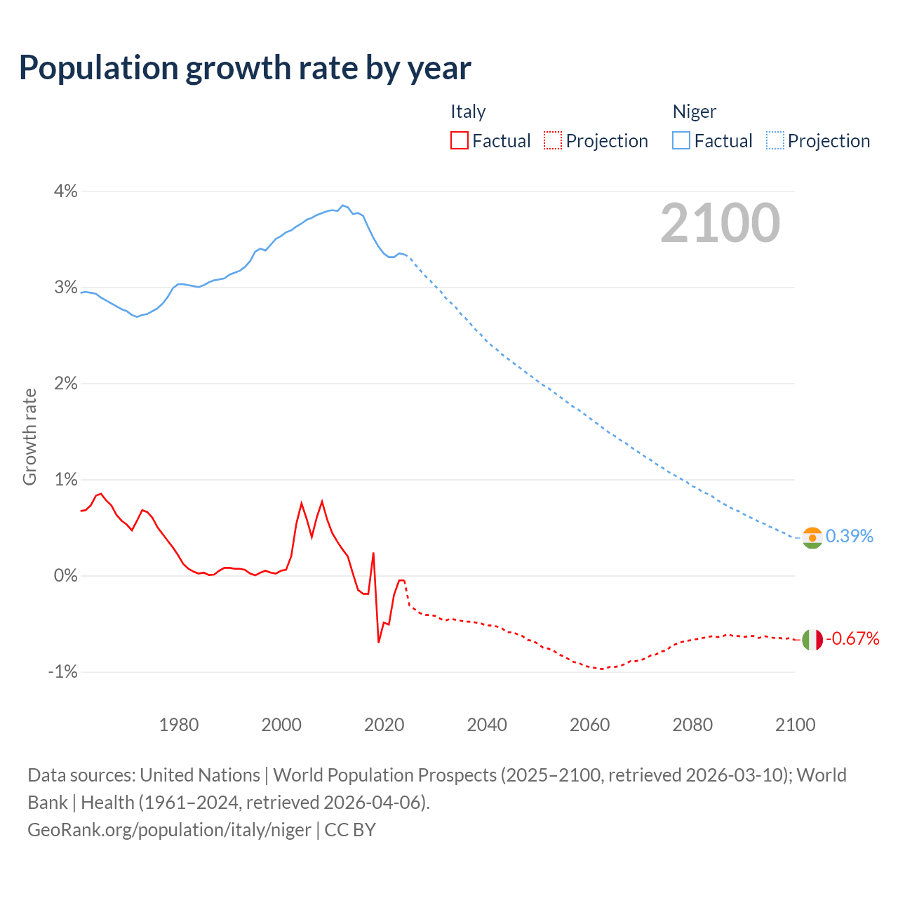 - For the last 10 years, Italy has had an average growth rate of -0.21% per year vs +3.5% in Niger.