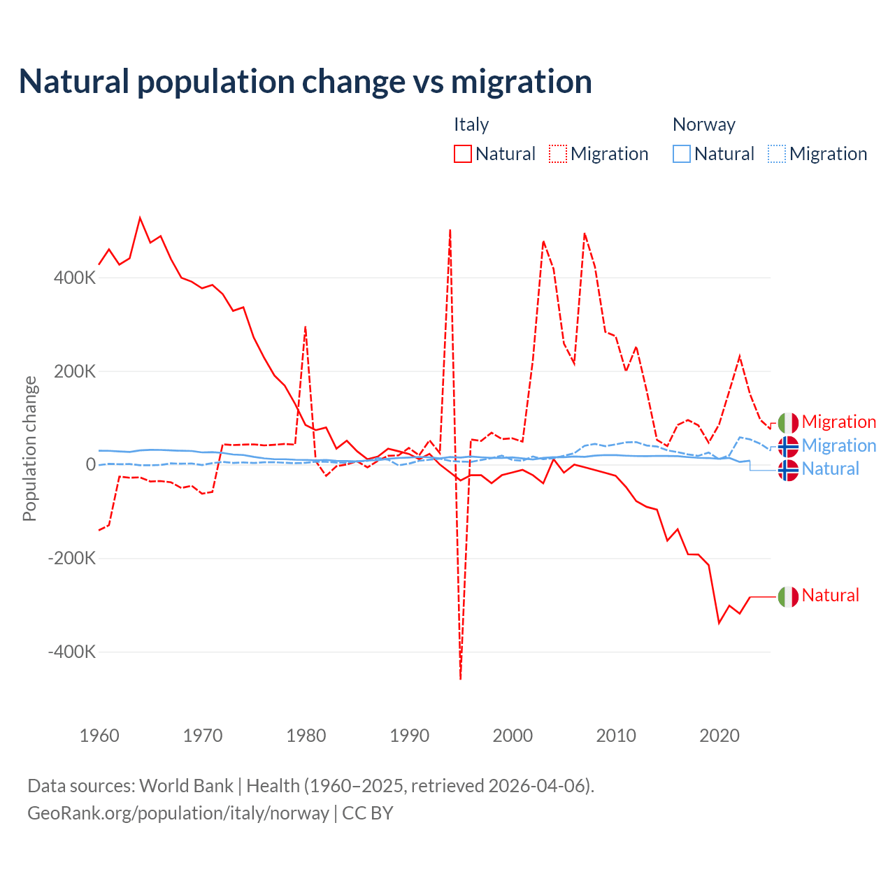 Over the last 10 years, 68.6% of the population change in Italy is from natural causes (a loss of 2,239,084 people) and 31.4% is from migration (a gain of 1,026,128 people). In Norway 31.3% is from natural causes (a gain of 138,699 people) and 68.7% is from migration (a gain of 303,945 people).