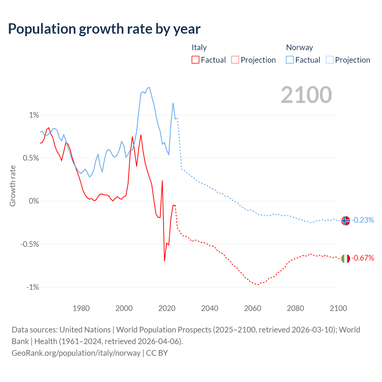 - For the last 10 years, Italy has had an average growth rate of -0.21% per year vs +0.85% in Norway.