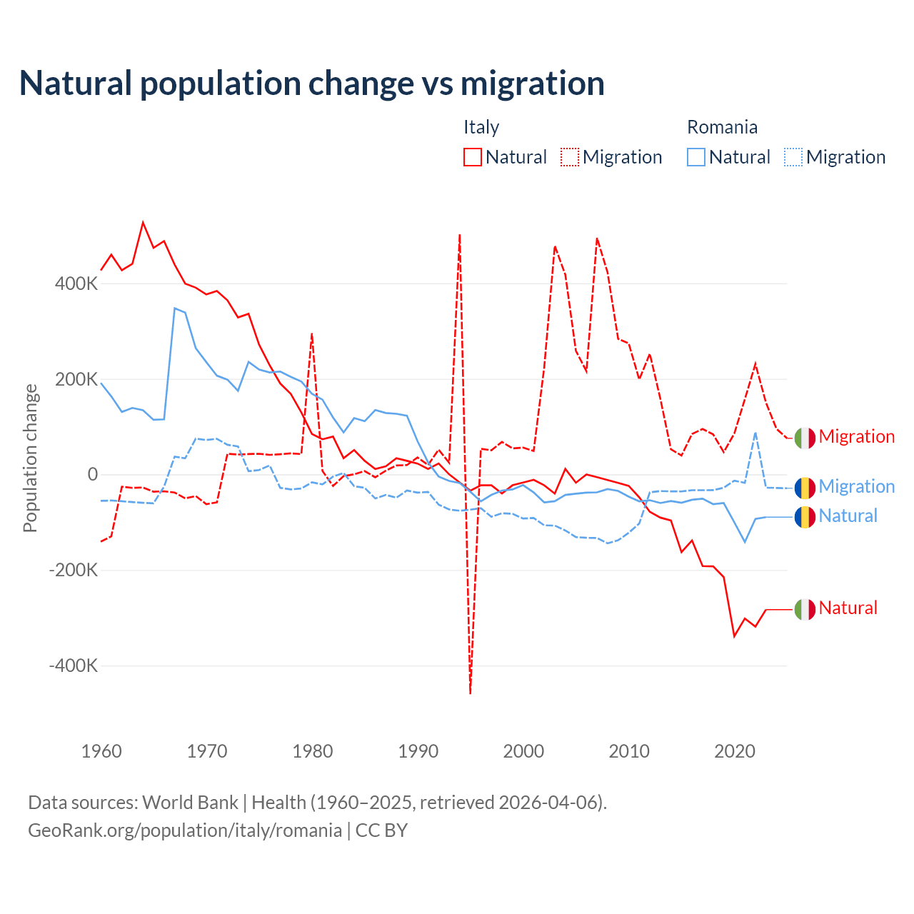 Over the last 10 years, 68.6% of the population change in Italy is from natural causes (a loss of 2,239,084 people) and 31.4% is from migration (a gain of 1,026,128 people). In Romania 82% is from natural causes (a loss of 766,295 people) and 18% is from migration (a loss of 167,917 people).