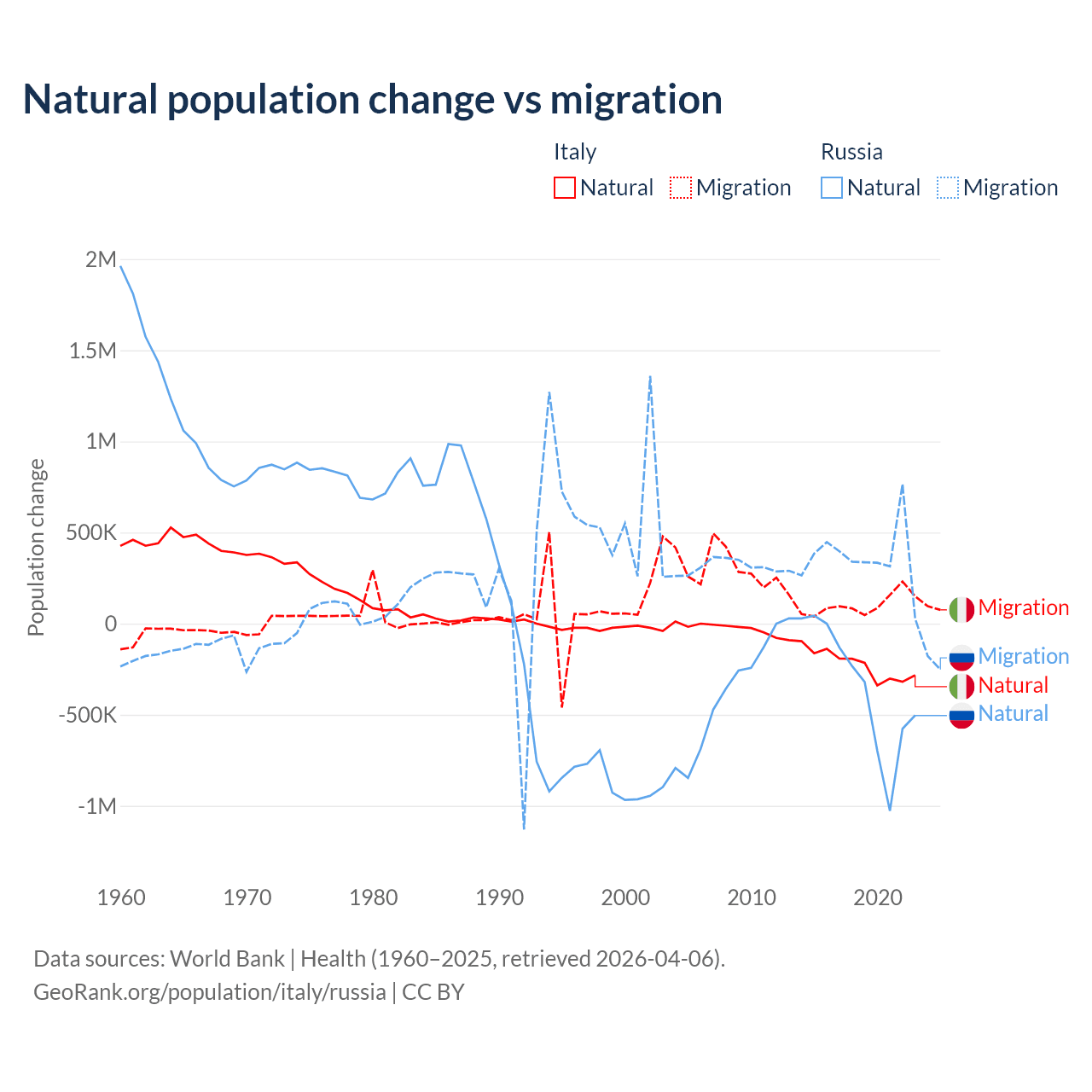 Over the last 10 years, 68.6% of the population change in Italy is from natural causes (a loss of 2,239,084 people) and 31.4% is from migration (a gain of 1,026,128 people). In Russia 48.6% is from natural causes (a loss of 3,416,377 people) and 51.4% is from migration (a gain of 3,611,826 people).