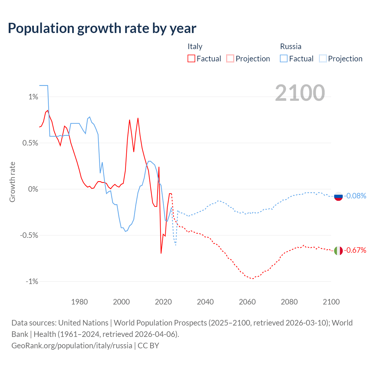 - For the last 10 years, Italy has had an average growth rate of -0.21% per year vs -0.02% in Russia.