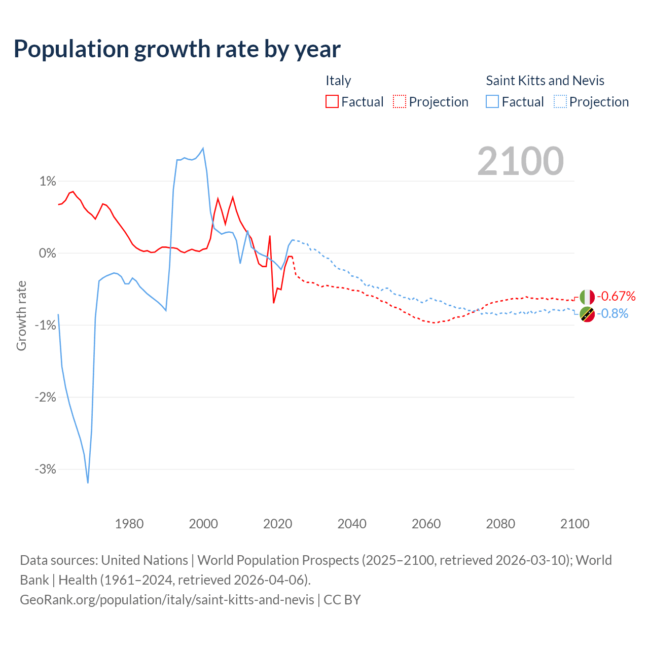 - For the last 10 years, Italy has had an average growth rate of -0.21% per year vs -0.04% in Saint Kitts and Nevis.