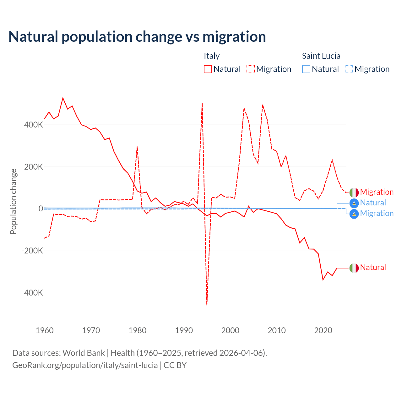 Over the last 10 years, 68.6% of the population change in Italy is from natural causes (a loss of 2,239,084 people) and 31.4% is from migration (a gain of 1,026,128 people). In Saint Lucia 95.7% is from natural causes (a gain of 6,039 people) and 4.31% is from migration (a loss of 272 people).