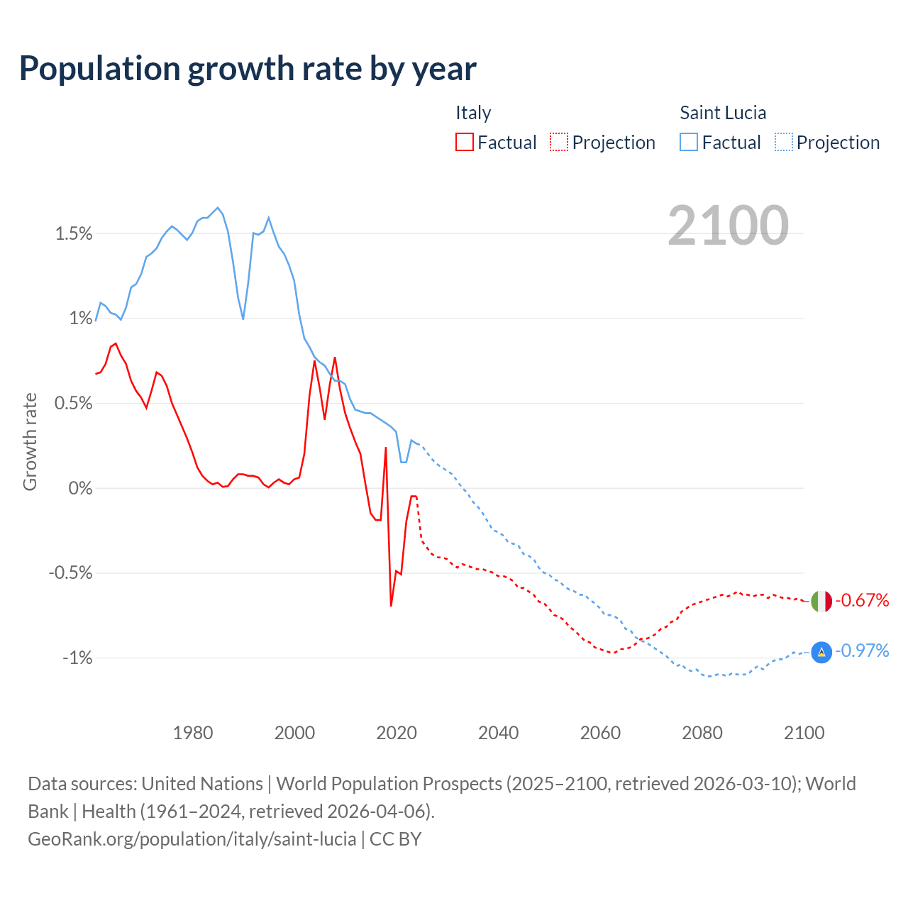 - For the last 10 years, Italy has had an average growth rate of -0.21% per year vs +0.33% in Saint Lucia.