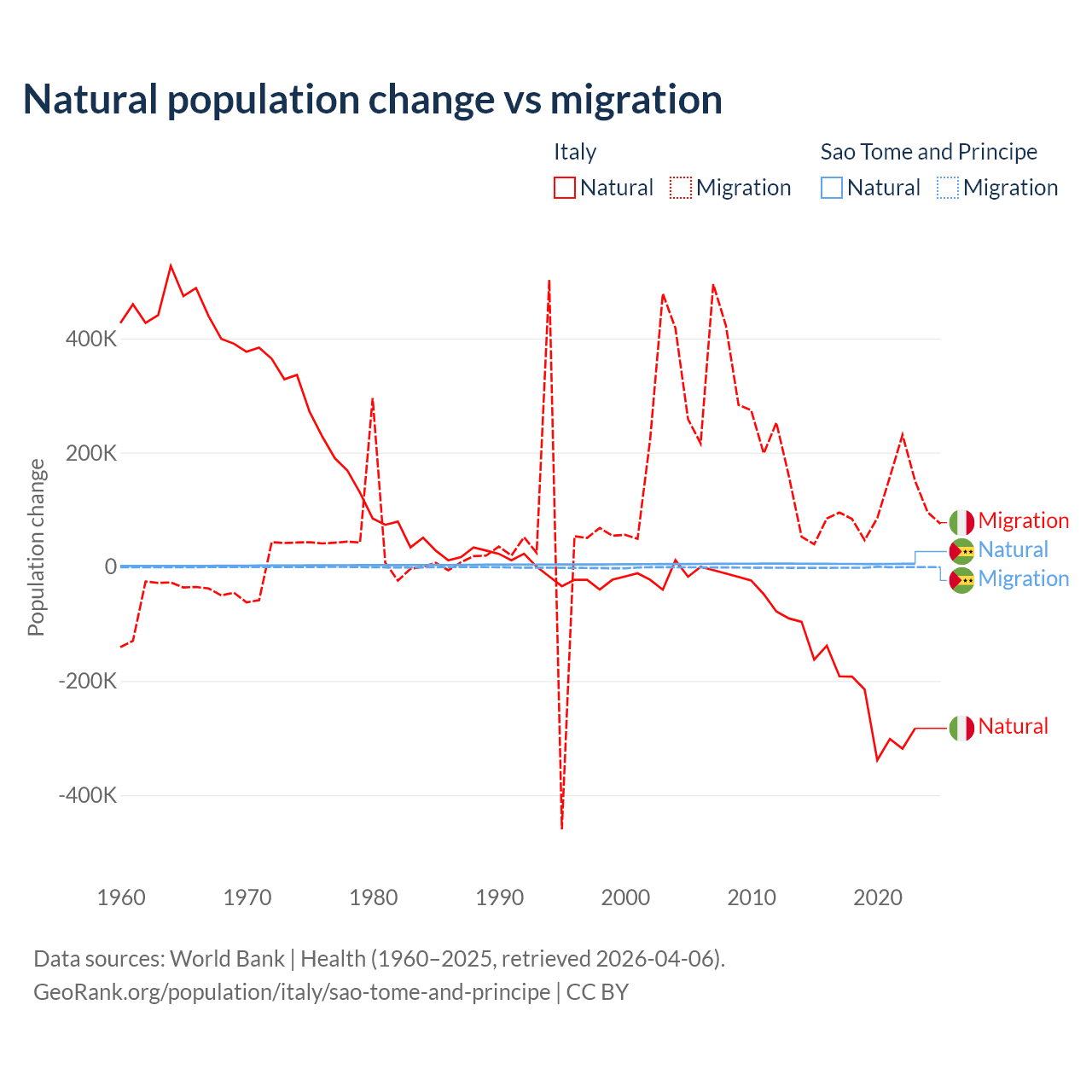 Over the last 10 years, 68.6% of the population change in Italy is from natural causes (a loss of 2,239,084 people) and 31.4% is from migration (a gain of 1,026,128 people). In Sao Tome and Principe 80.1% is from natural causes (a gain of 50,822 people) and 19.9% is from migration (a loss of 12,621 people).