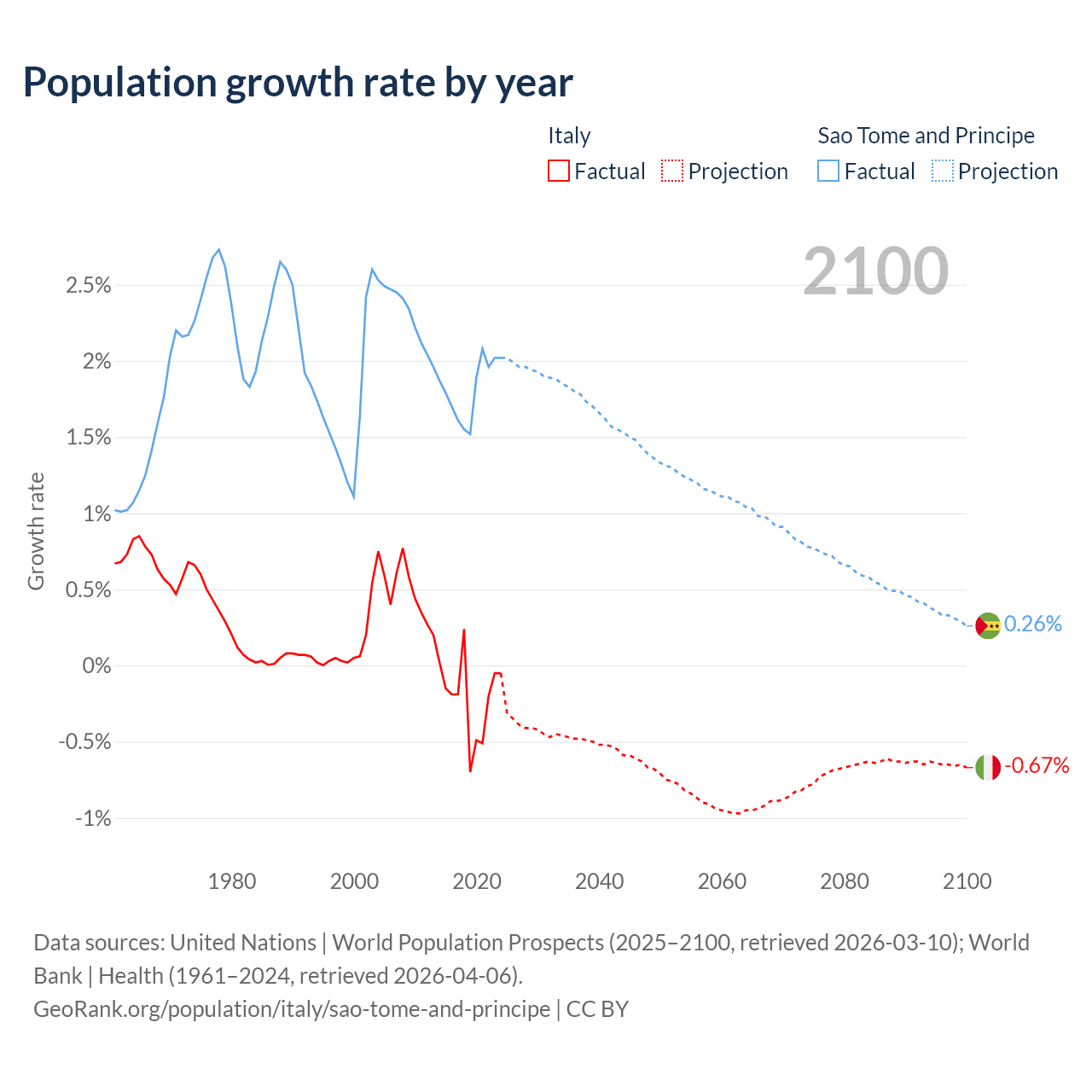 - For the last 10 years, Italy has had an average growth rate of -0.21% per year vs +1.82% in Sao Tome and Principe.