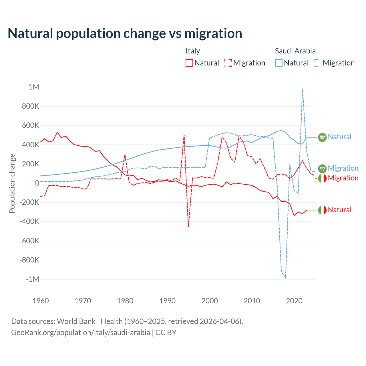 Over the last 10 years, 68.6% of the population change in Italy is from natural causes (a loss of 2,239,084 people) and 31.4% is from migration (a gain of 1,026,128 people). In Saudi Arabia 93.9% is from natural causes (a gain of 4,829,562 people) and 6.05% is from migration (a gain of 311,209 people).