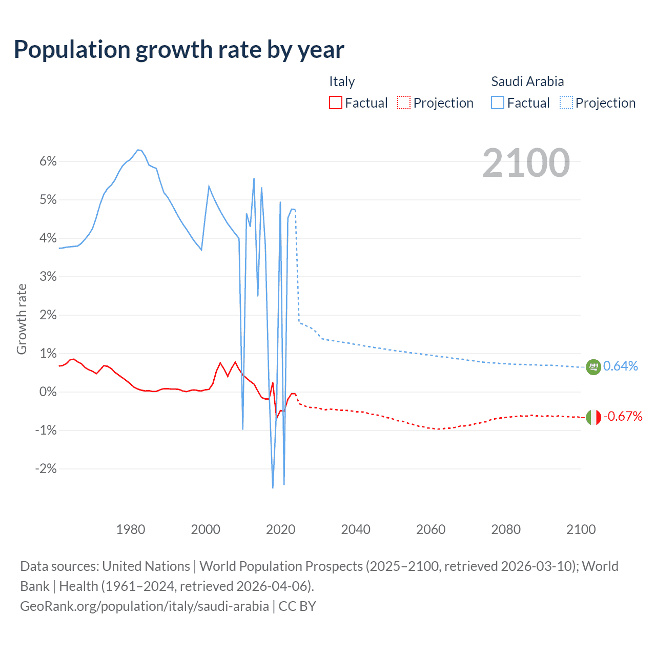- For the last 10 years, Italy has had an average growth rate of -0.21% per year vs +2.3% in Saudi Arabia.