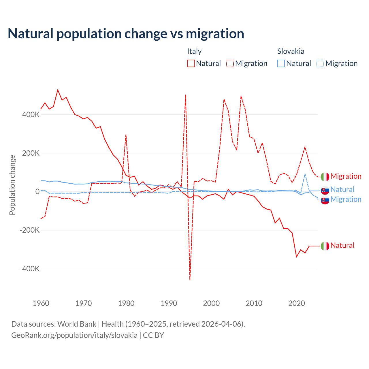 Over the last 10 years, 68.6% of the population change in Italy is from natural causes (a loss of 2,239,084 people) and 31.4% is from migration (a gain of 1,026,128 people). In Slovakia 7.47% is from natural causes (a loss of 8,728 people) and 92.5% is from migration (a gain of 108,156 people).