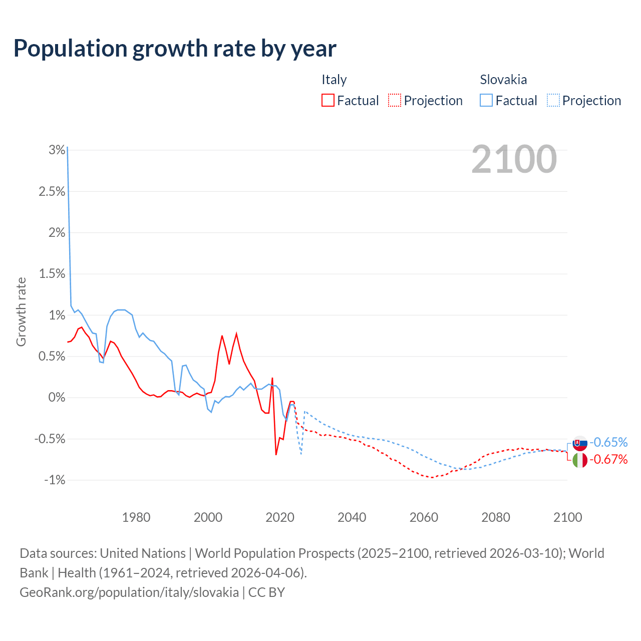 - For the last 10 years, Italy has had an average growth rate of -0.21% per year vs +0.01% in Slovakia.