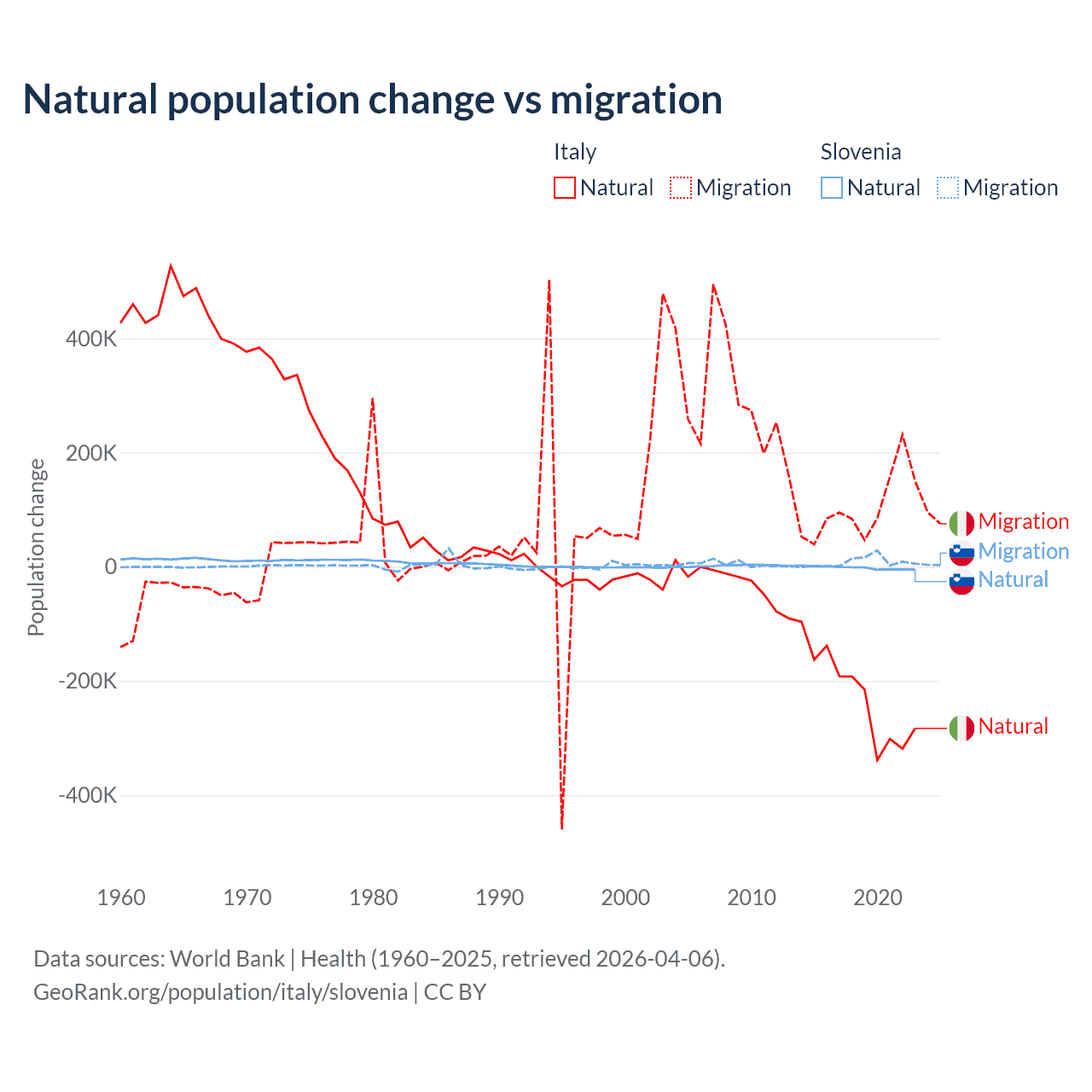 Over the last 10 years, 68.6% of the population change in Italy is from natural causes (a loss of 2,239,084 people) and 31.4% is from migration (a gain of 1,026,128 people). In Slovenia 18.1% is from natural causes (a loss of 17,573 people) and 81.9% is from migration (a gain of 79,532 people).