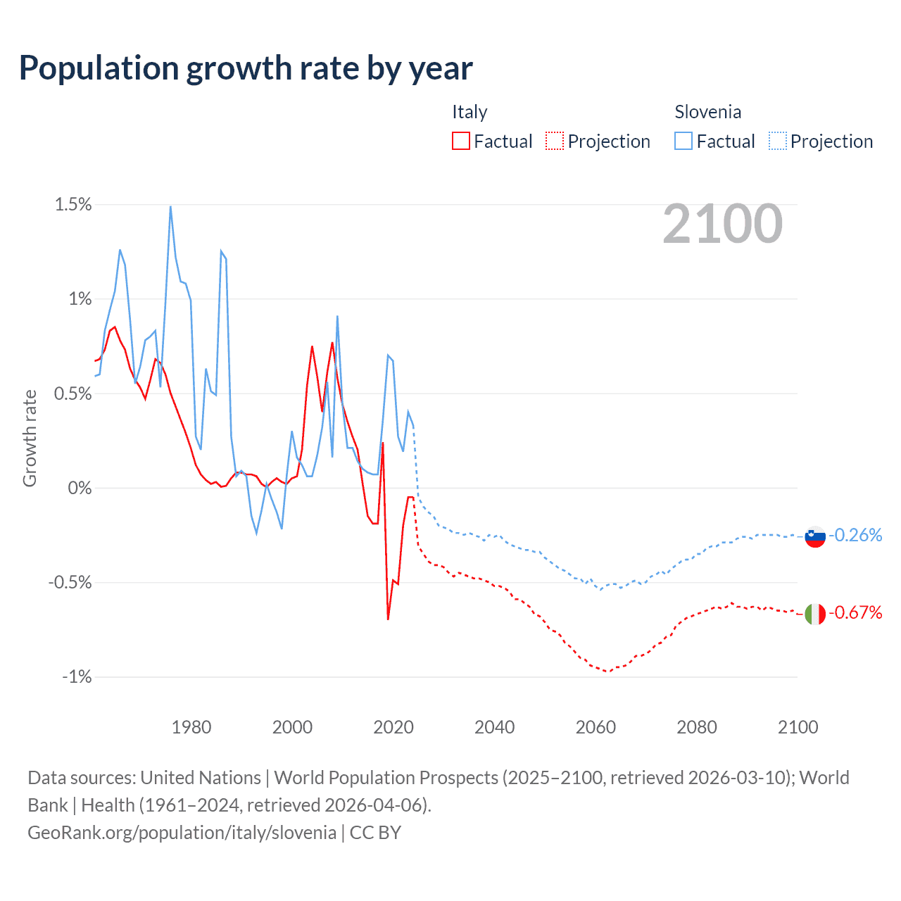 Data sources: World Bank | Health (1960–2024, retrieved 2026-04-06); United Nations | World Population Prospects (1960–2026, retrieved 2026-03-10); U.S. Census Bureau (1960–2025, retrieved 2026-02-08); Central Intelligence Agency (CIA) (2000–2019, retrieved 2026-02-20).