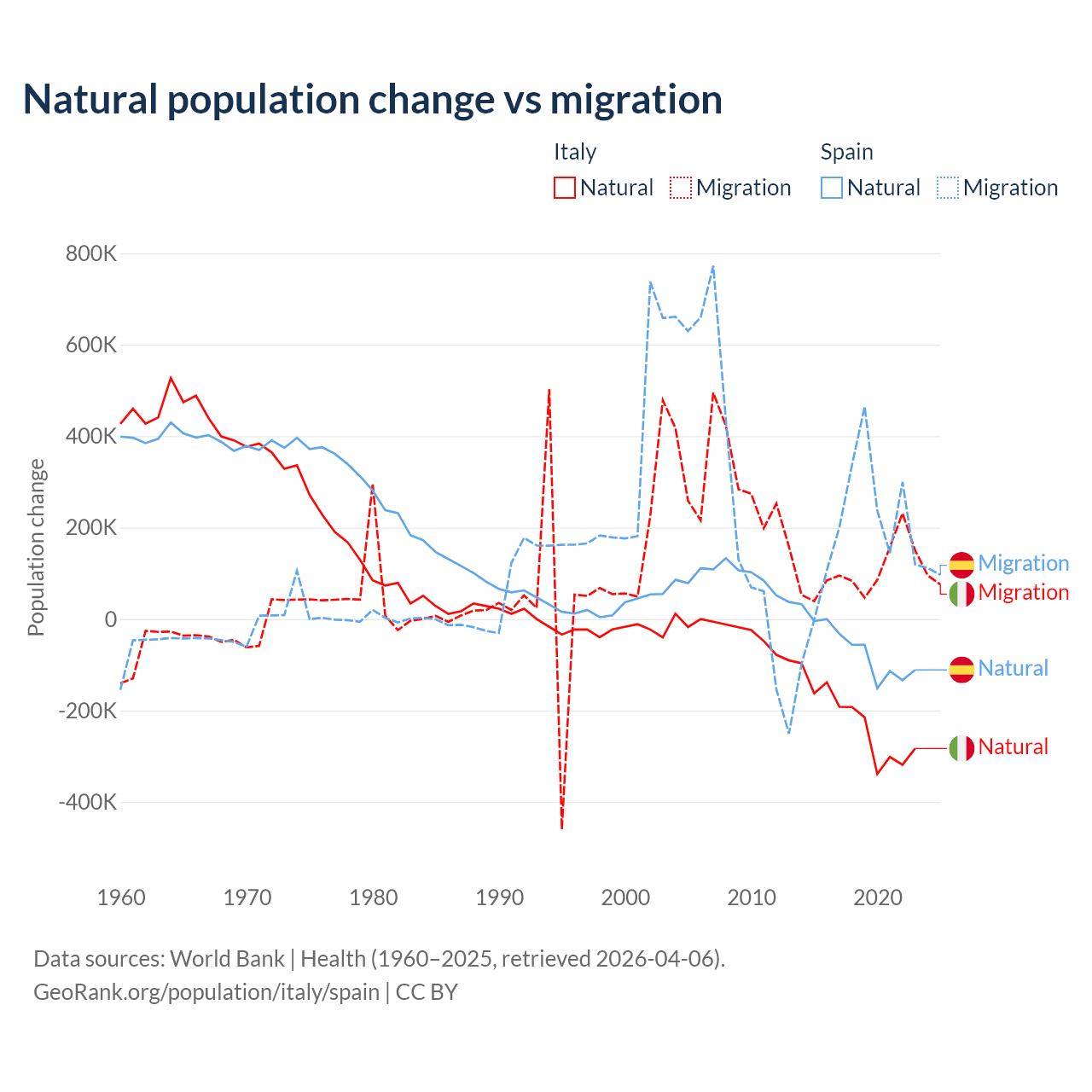 Over the last 10 years, 68.6% of the population change in Italy is from natural causes (a loss of 2,239,084 people) and 31.4% is from migration (a gain of 1,026,128 people). In Spain 25.8% is from natural causes (a loss of 627,829 people) and 74.2% is from migration (a gain of 1,810,127 people).